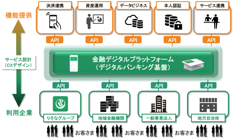 りそなHDでは、中期経営計画において「デジタル&データ」「デザイン思考」「オープン」を成長のドライバーとして掲げ、API連携などの戦略的な活用を通じて本格的なシステム統合を行うことなく独自の商品・サービスを地域金融機関、一般事業法人や地方自治体へ提供する金融サービスのオープンプラットフォーム化を推進しています。