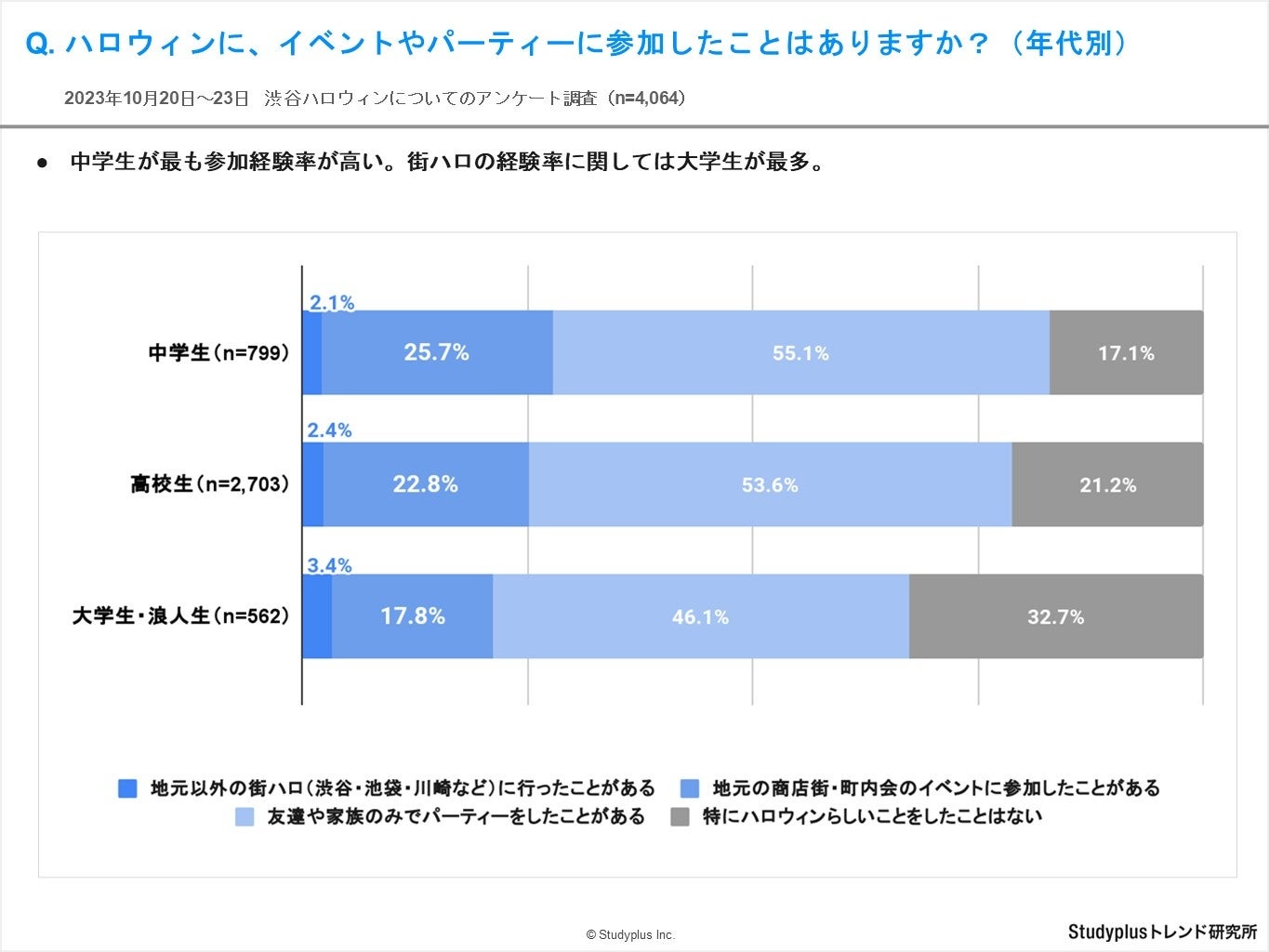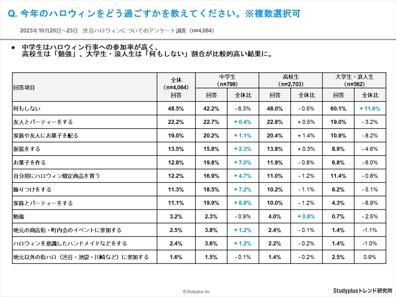 ・中学生はハロウィン行事への参加率が高く、高校生は「勉強」、大学生・浪人生は「何もしない」割合が比較的高い結果に。