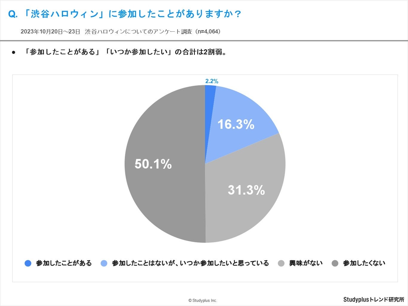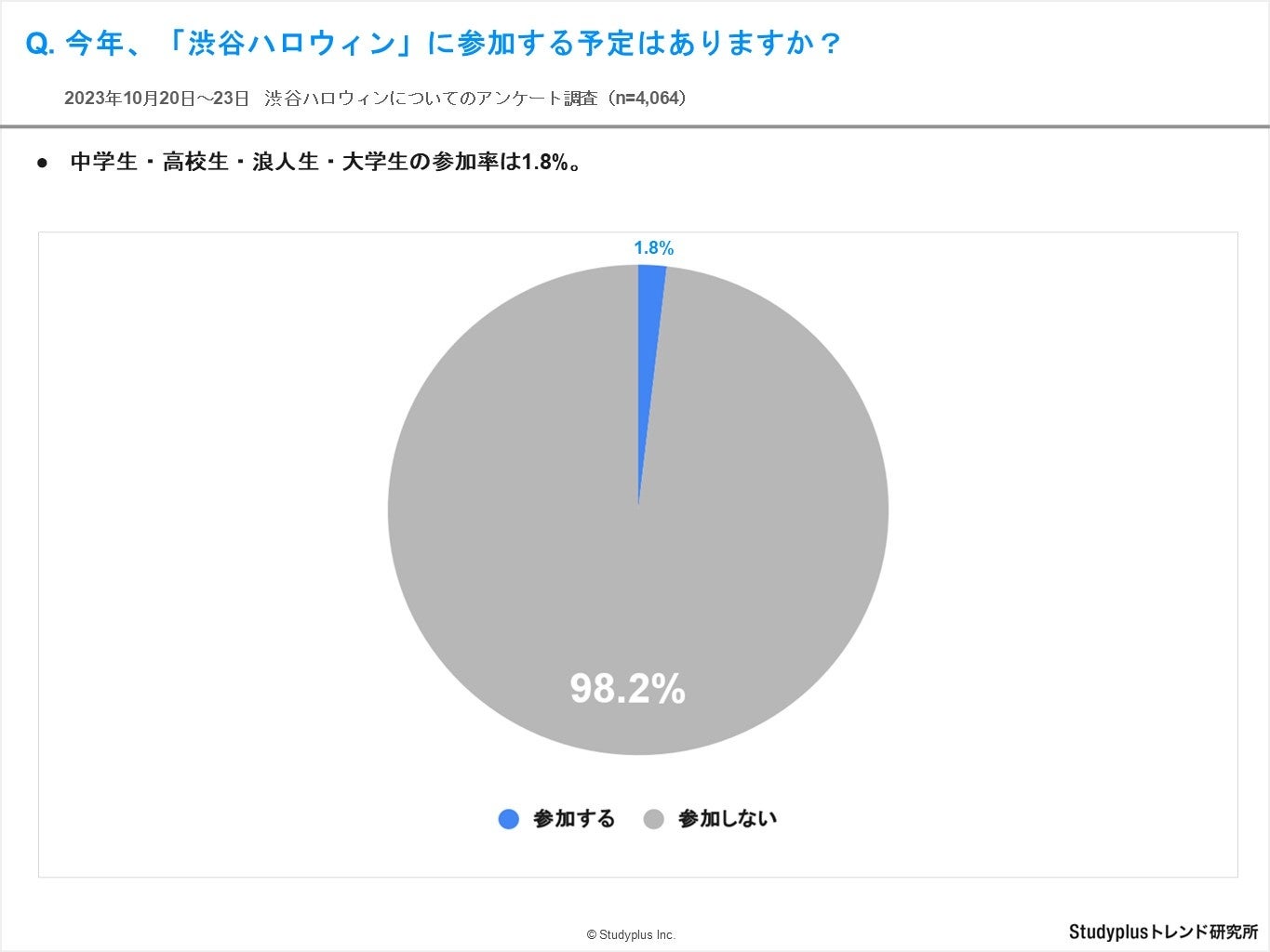 ① | 中学生・高校生・浪人生・大学生、今年の「渋谷ハロウィン」参加率は1.8%。 「参加したことがある」「いつか参加したい」という回答は2割弱集まる結果に。 |