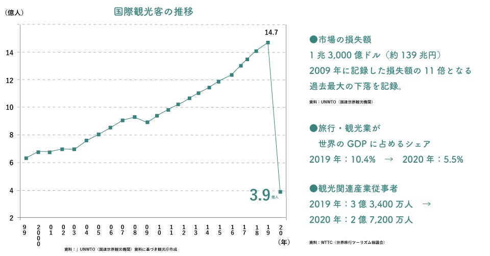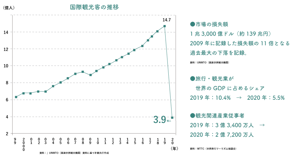 国連世界観光機関(UNWTO)によると、2020年の国際観光客は新型コロナウイルス感染症拡大防止のための渡航制限等により、前年比10億7,200万人減の3億 9,400万人となり、前年と比べると73.1%と大きく減少しています。また、世界旅行ツーリズム協議会(WTTC)によると、2020年には、旅行・観光業が世界のGDPに占めるシェアが約10.4%から約5.5%に半減し、観光関連産業従事者は6,200万人近く(約18.5%減)の雇用が減少している現状があります。その影響は当然日本も受けており、2020年の訪日外国人旅行者数は前年と比べると87.1%減少の412万人となっています。インバウンドの落ち込みだけではなく、国内における2020年の日本人の国内宿泊旅行延べ人数は前年比48.4%減の1億6,070万人、日帰り旅行延べ人数は前年比51.8%減の1億3,271万人と大きく影響を受け、2020年の日本人国内旅行消費額は10.0兆円(前年比54.5%減)となりました。観光立国を掲げる日本において、新型コロナウイルス感染症を踏まえた観光の新たな展開は今後非常に重要となってくるでしょう。