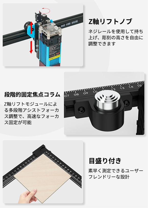 - レーザー彫刻機は455±5nm高品質半導体レーザーやLD+FAC+C-lensレーザー技術を用いており、レーザービームスポット径はわずか0.08mmのため、刻印精度が高くなります。0.1mmの高精細な彫刻を実現!文字や画像を精細に描き出すことができます。
