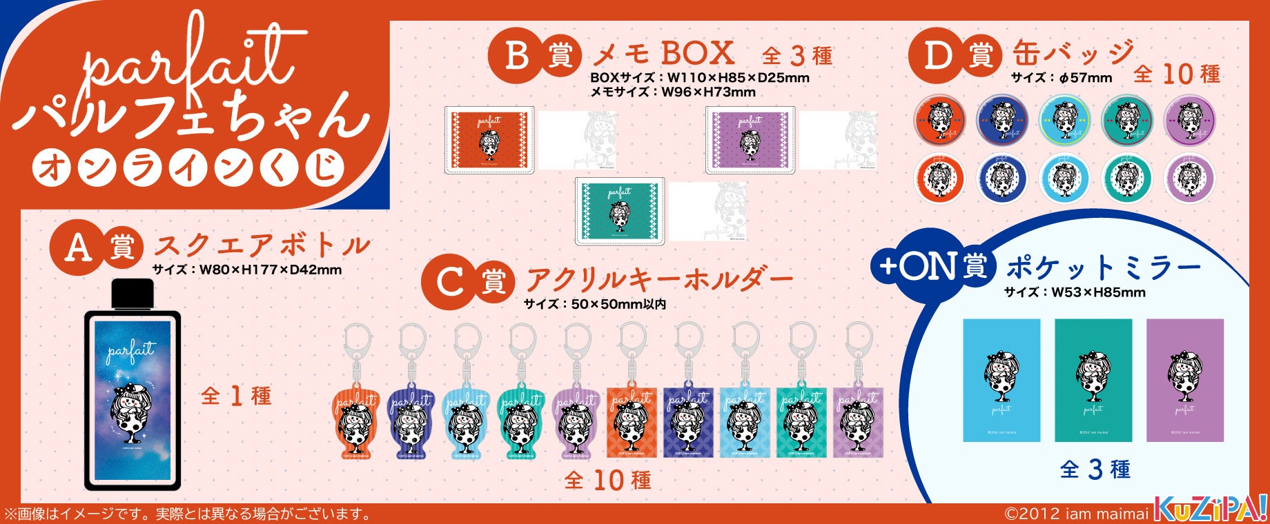 株式会社CREST(本社:東京都新宿区、代表取締役:三上政高/梁 俊模、以下「CREST」)は、運営するオンラインくじサービス「KuZiPA!」において、イラストレーター「IAM MAIMAI」が描く『パルフェちゃん』くじを10月28日(金)12時より販売開始致します。全てのアイテムにクジパ限定レトロカラーを採用しています。