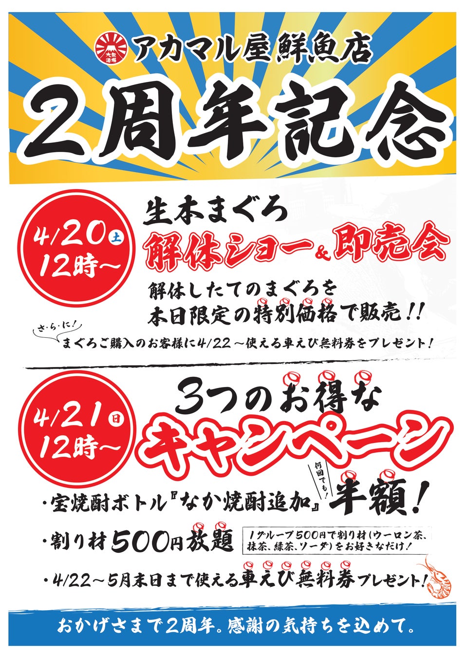 おかげさまで2周年!アカマル屋鮮魚店 大宮すずらん通り店にて、2年間の感謝を込め『生本鮪の解体ショー&即売会』を開催!4月20日(土)12:00~!その他お得な特典も!