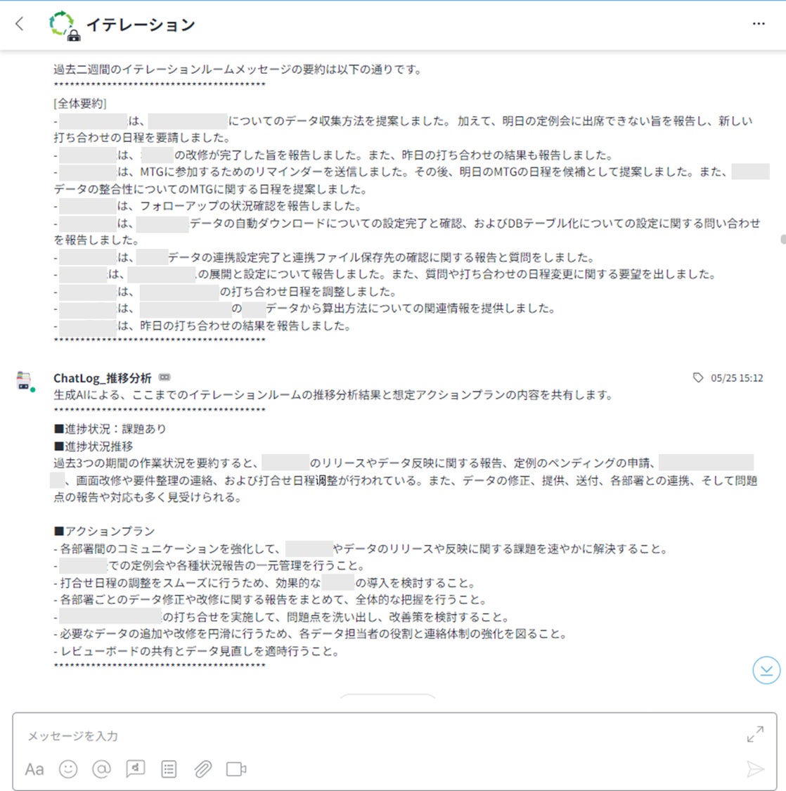 dejirenのバーチャルアシスタント機能に生成AIを組み合わせ、やりとりされたメッセージを取得するとともに生成AIで解析、分かりやすく要約し、傾向推移の状況分析から経営層にアクションプランを自動配信。チャット内の複数のチャンネルから必要な情報を参照し情報を要約する煩雑な業務が効率化されました。