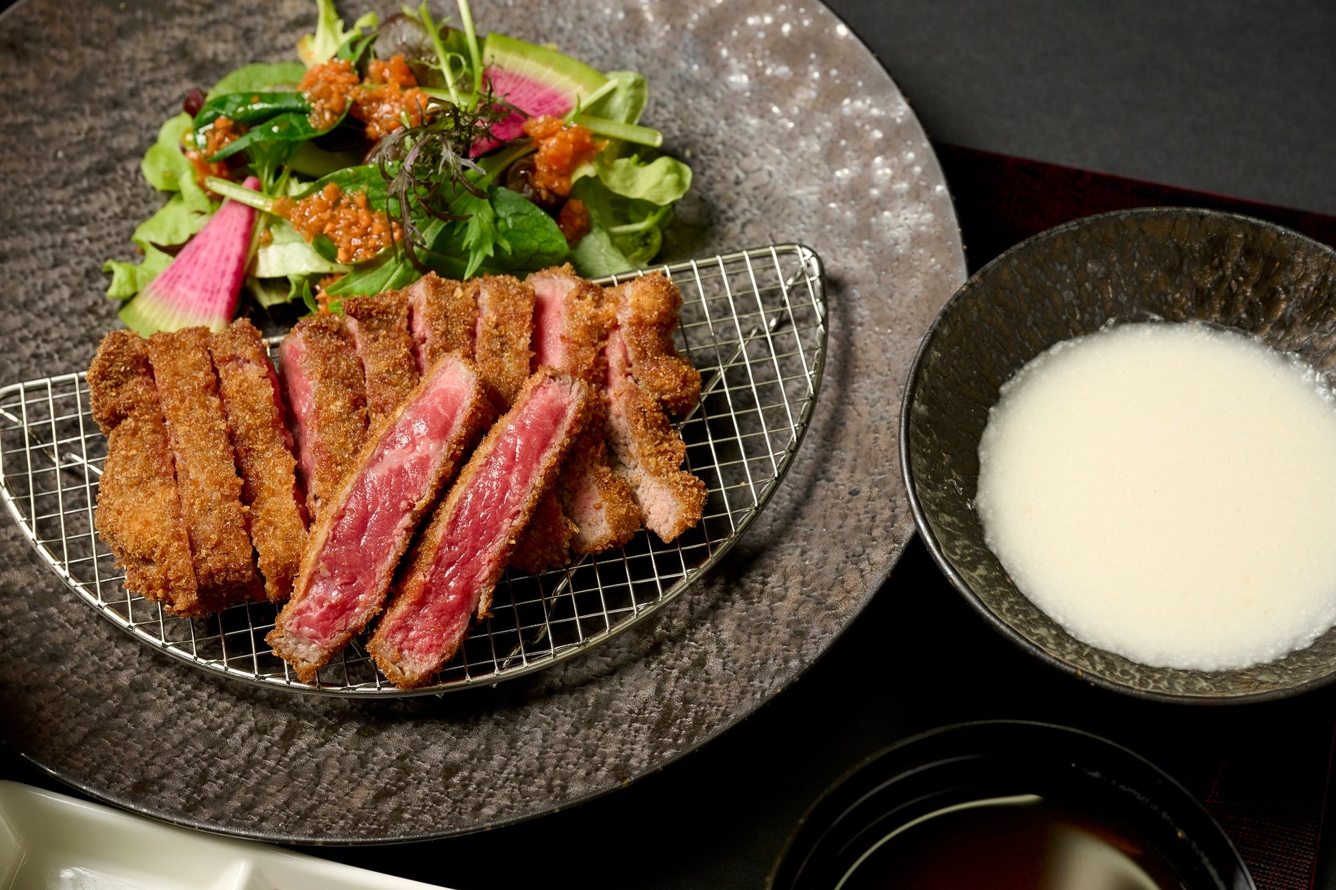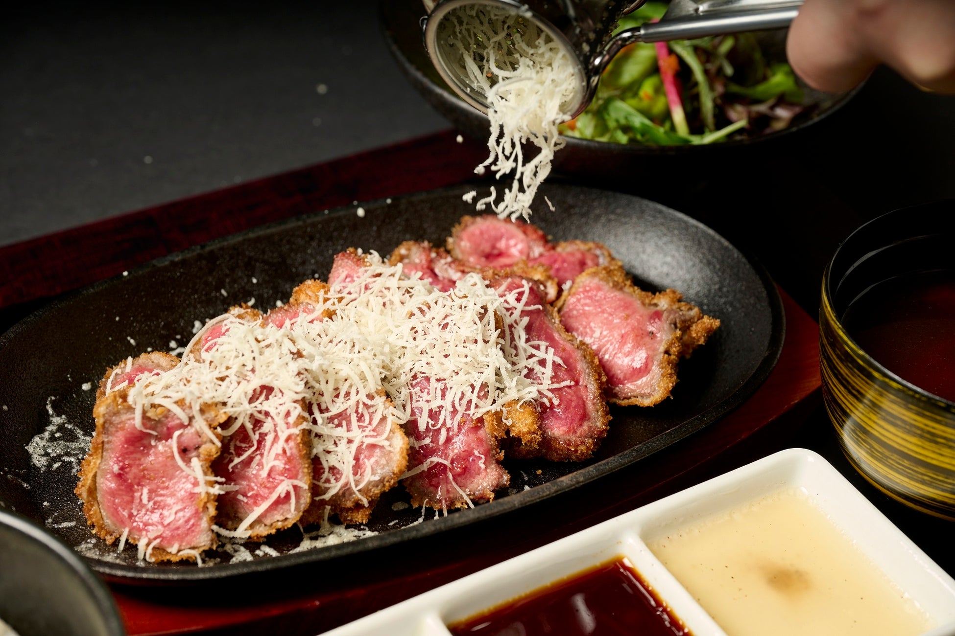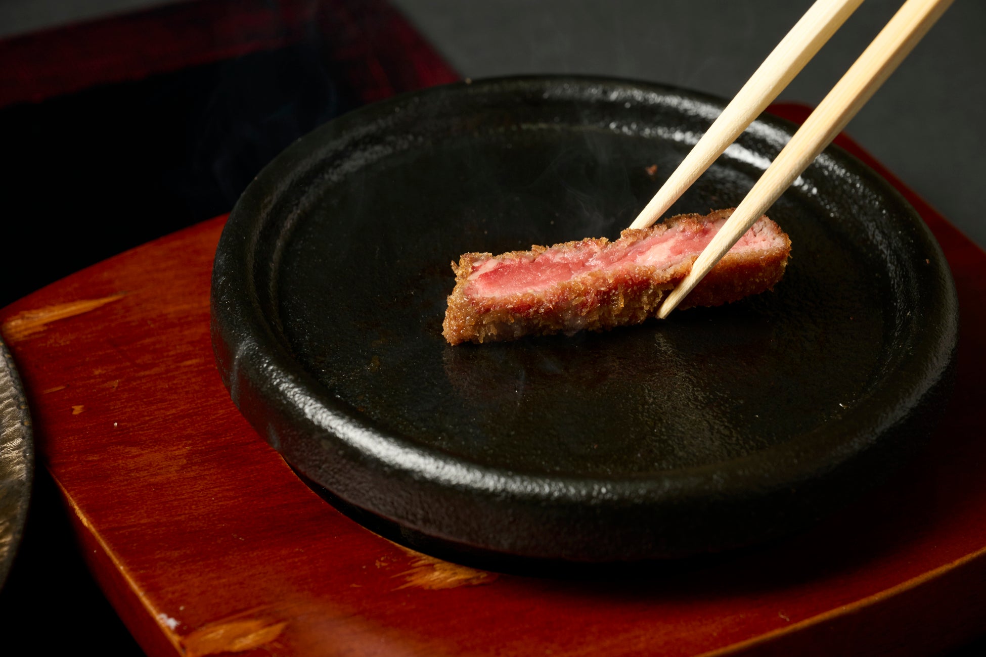 牛カツ、牛タンカツは美しい赤身のミディアムレアでご提供いたします。付属の石焼きプレート(ペレット)にて、お客様の好みの焼き加減に仕上げて、お召し上がりください。