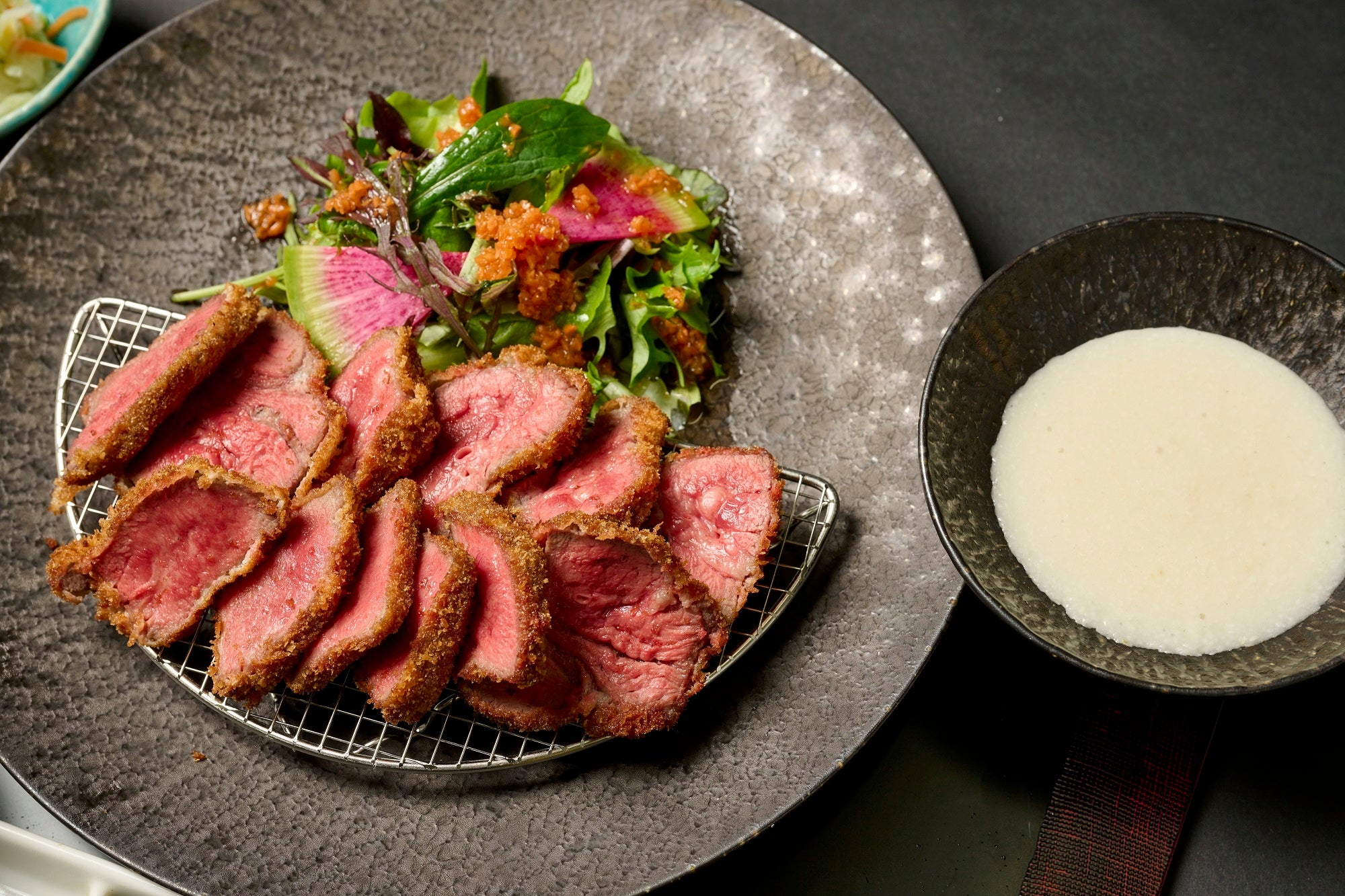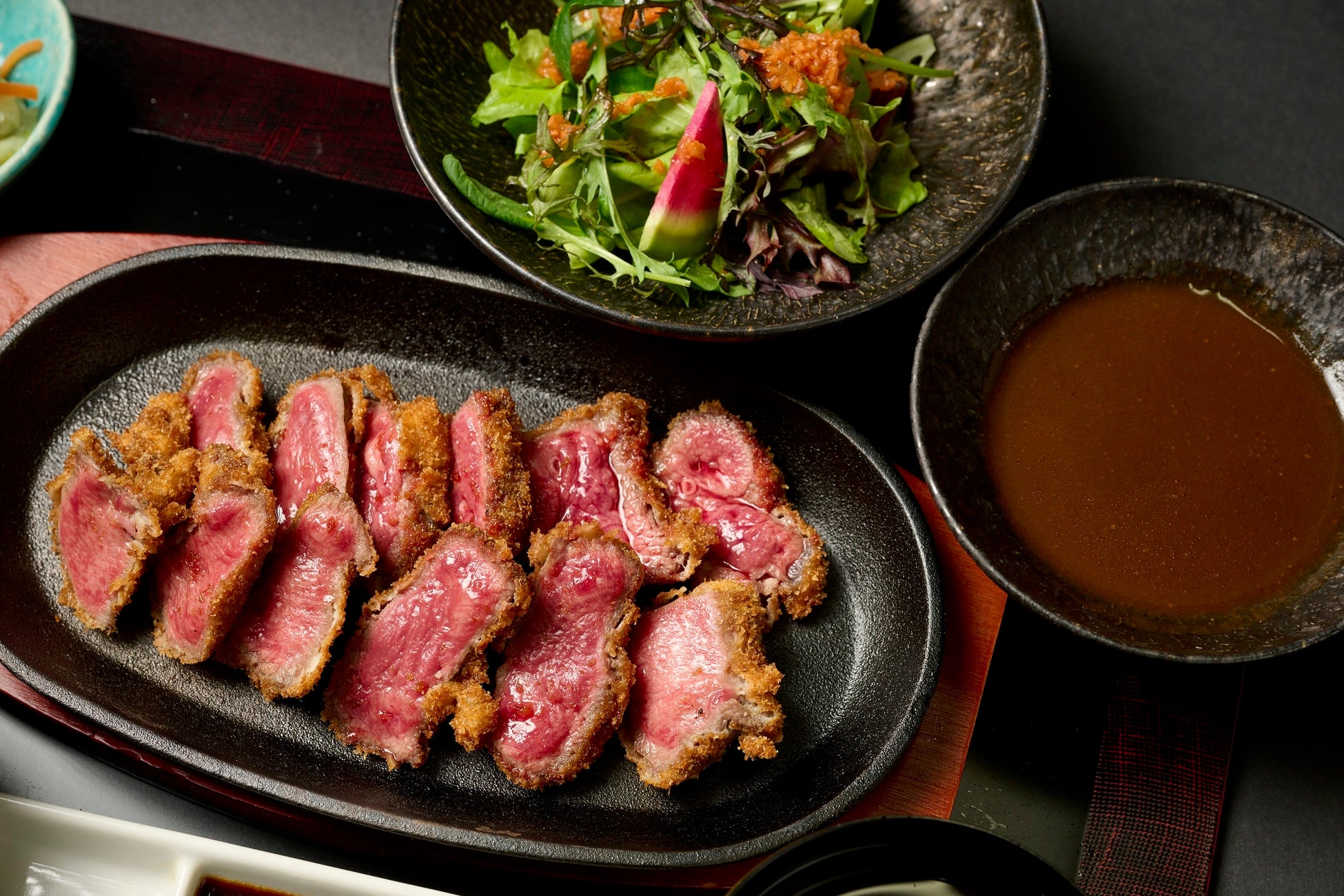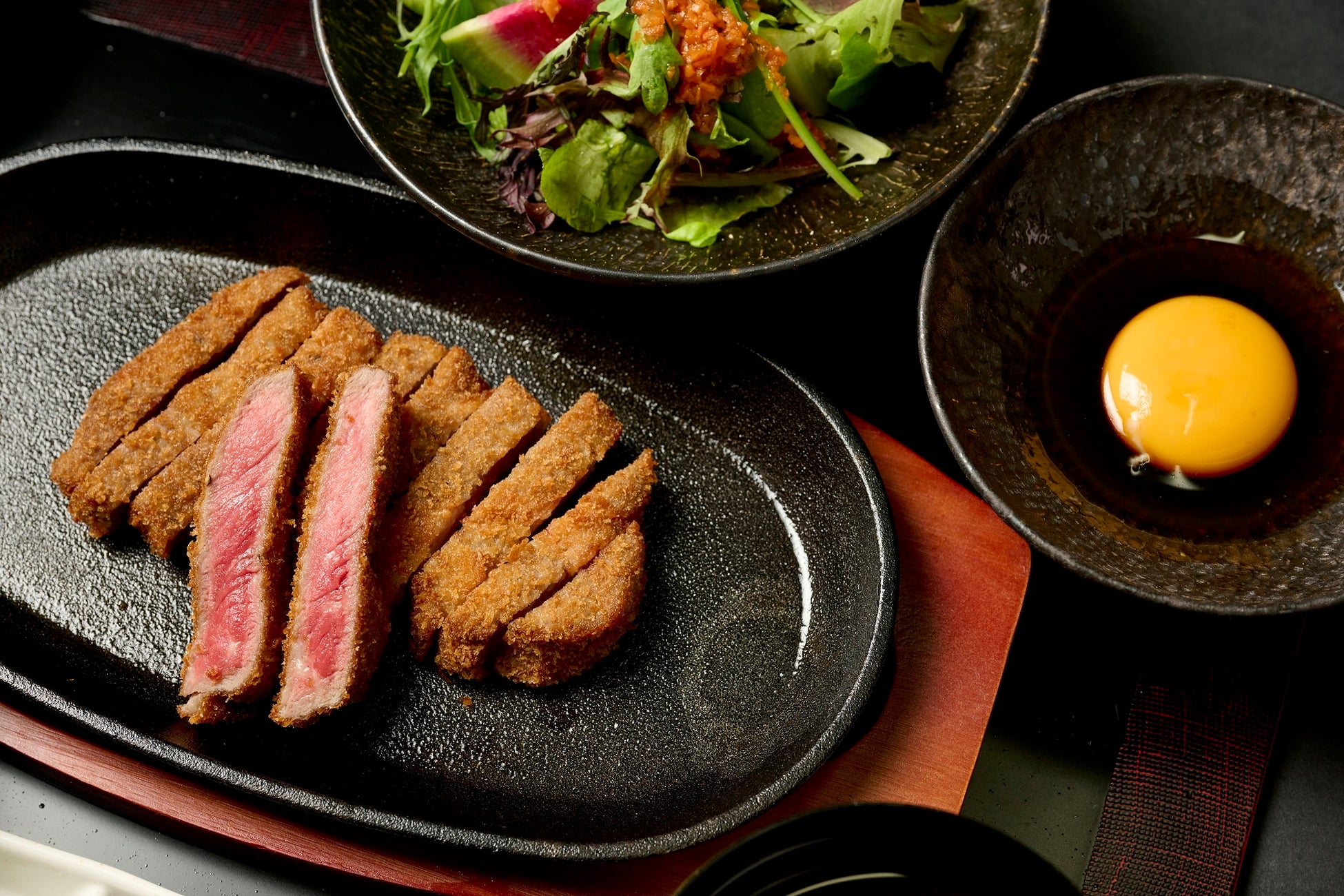 牛カツ、牛タンカツは美しい赤身のミディアムレアでご提供いたします。付属の石焼きプレート(ペレット)にて、お客様の好みの焼き加減に仕上げて、お召し上がりください。