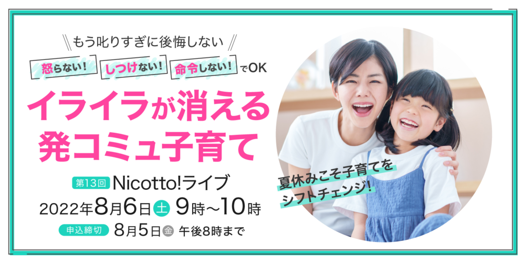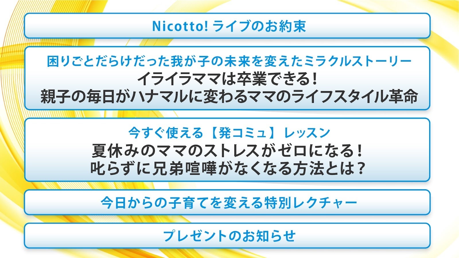 今回のNicotto!ライブでは、ママがニコニコ笑っていられる環境を創り出し、維持するための新しい方法をお伝えします。