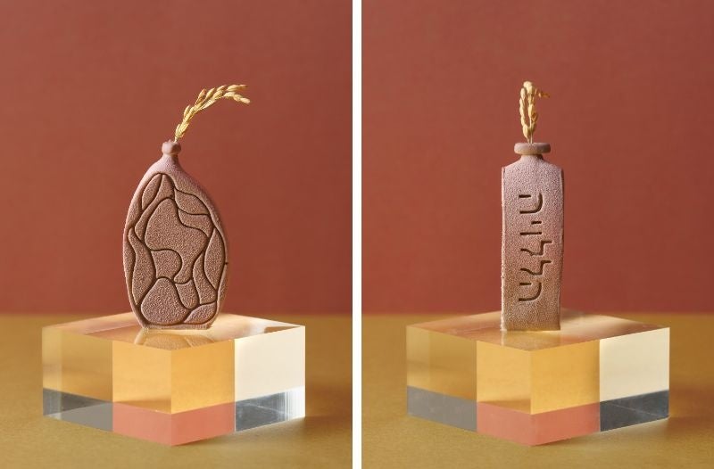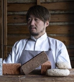 今回、メインに使用した食材は、ハレの日にもケの日にも、日本人のそばに寄り添ってきたお米、みかん、梅。お米の凝固性を活用した梅のムースの中に、実も薄皮も外皮も全て余す事なく使用し、果肉部分をぬかに漬けて味わいを凝固させたみかんのジュレを入れ、下には水分を抜いて凝縮した豆腐と梅干を使った、まるでチーズのような味わいのクリームと、紅しょうがのフルーティーで爽快な刺激を活かしたシロップを浸したおからのビスキュイ生地、お米の粉を使った軽やかで香ばしいサブレを重ねました。表面の灰色と桜色は、ハレとケの共存をイメージし、無造作に並んだ田からインスピレーションを受けた表面の模様は御新酒徳利を彷彿とされるお米の形状を表現しています。