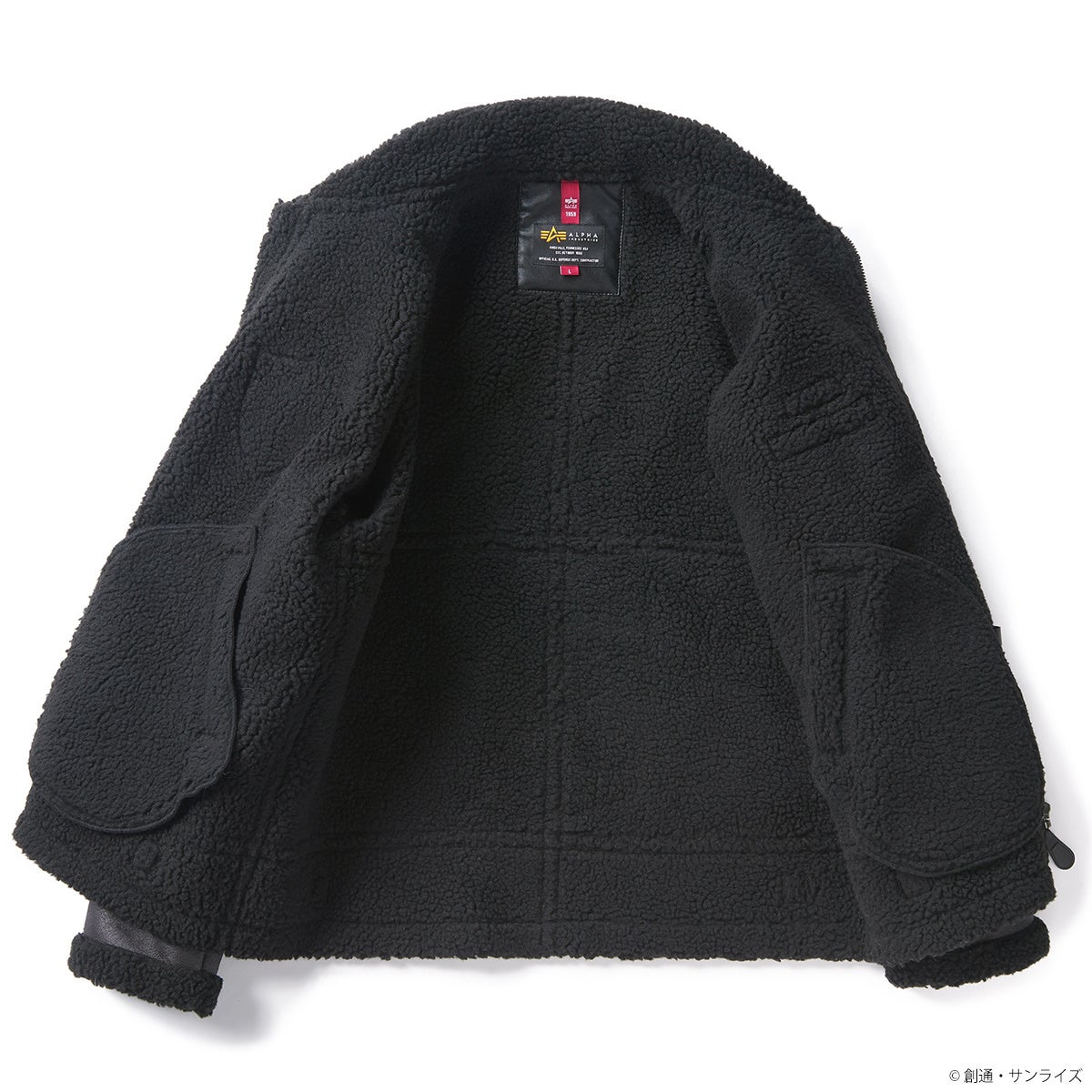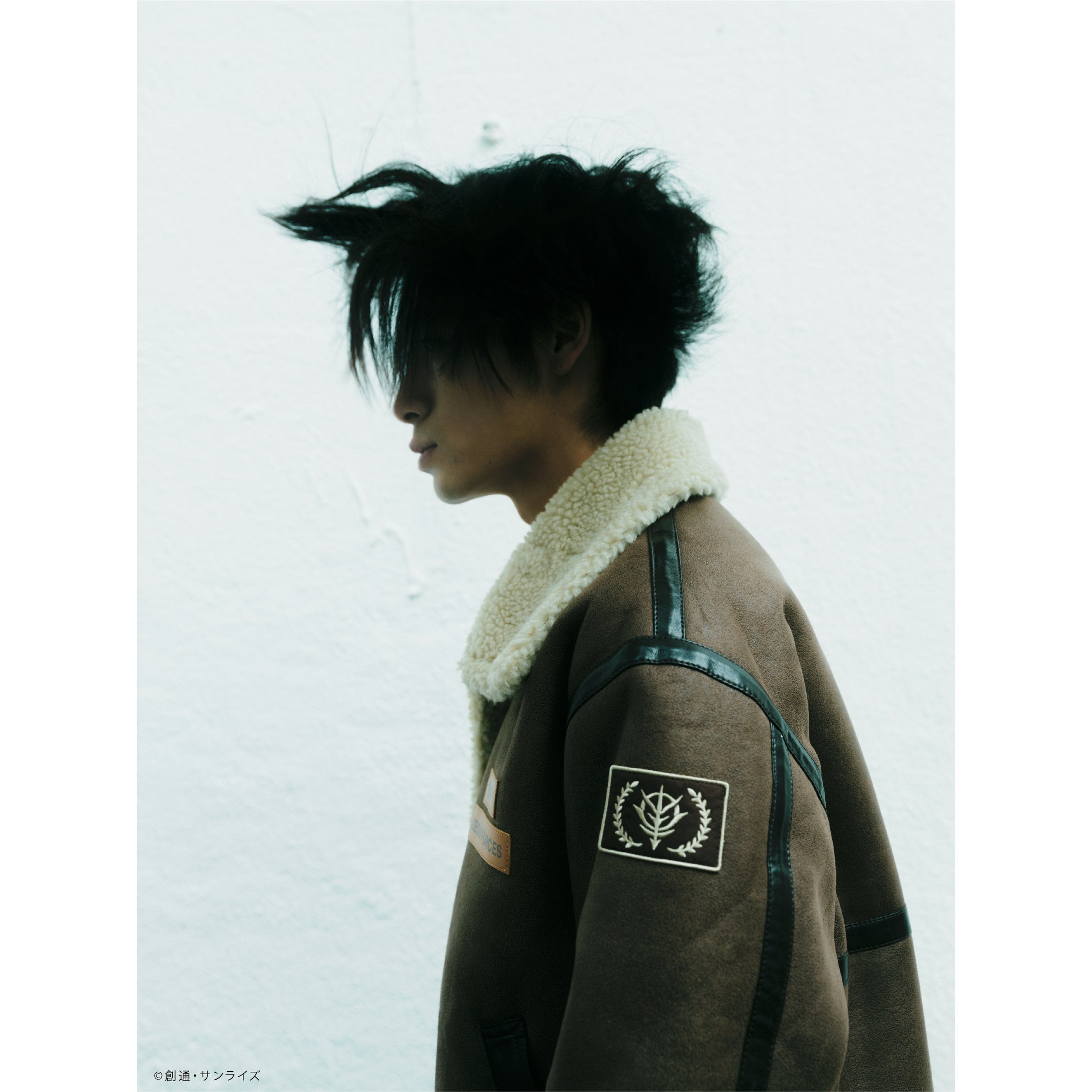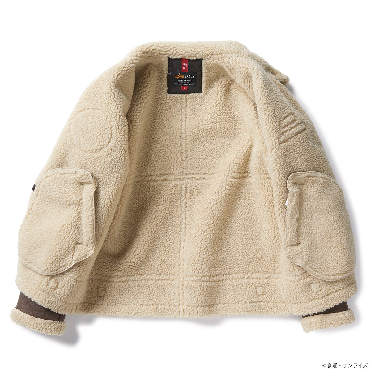 STRICT-GとALPHA INDUSTRIES(アルファ インダストリーズ)のコラボによるフェイクムートン仕様の『機動戦士ガンダム』B-3ジャケットは、リアルに見える素材感にこだわったアイテム。内側全面がボア仕様となっており、保温性と着心地を両立しています。