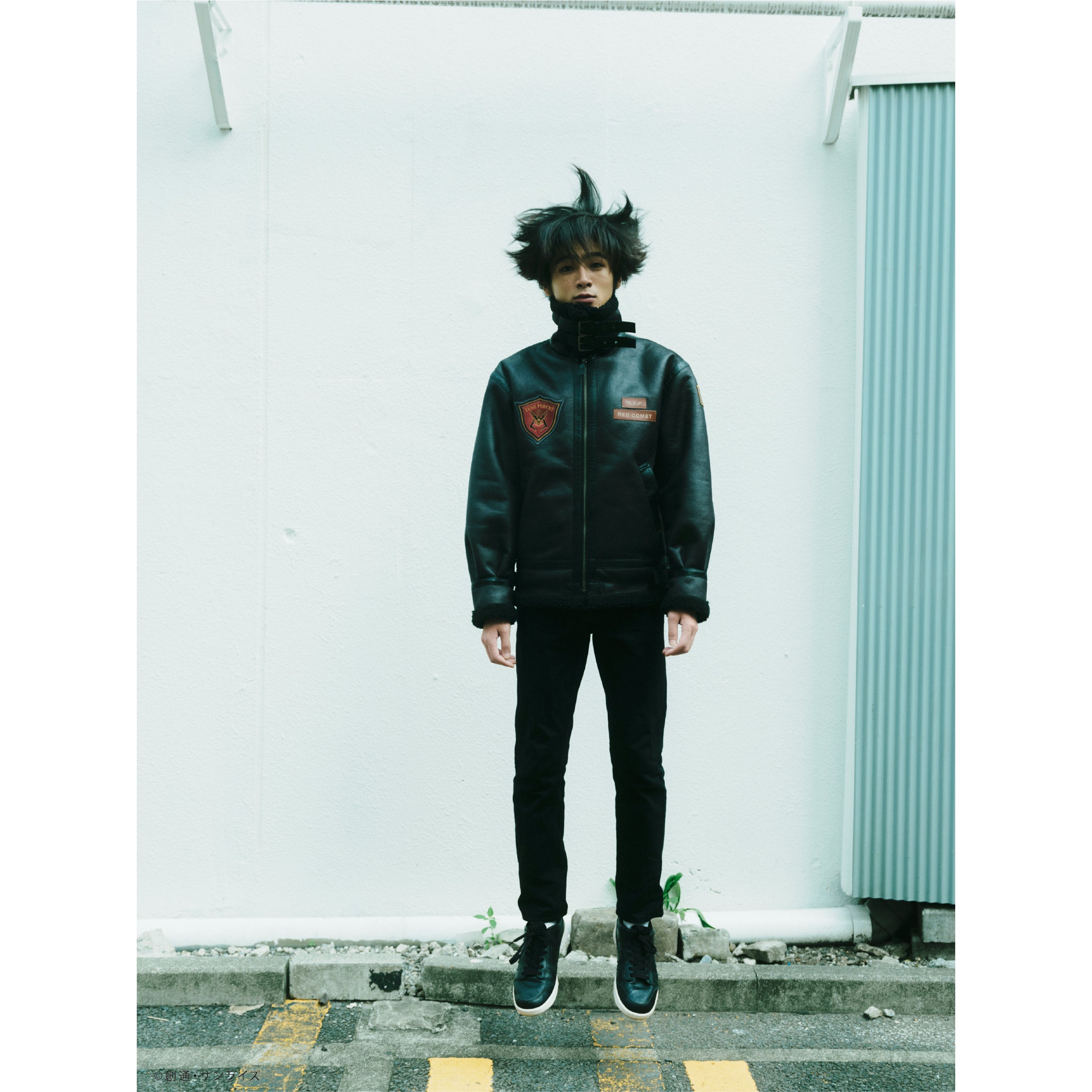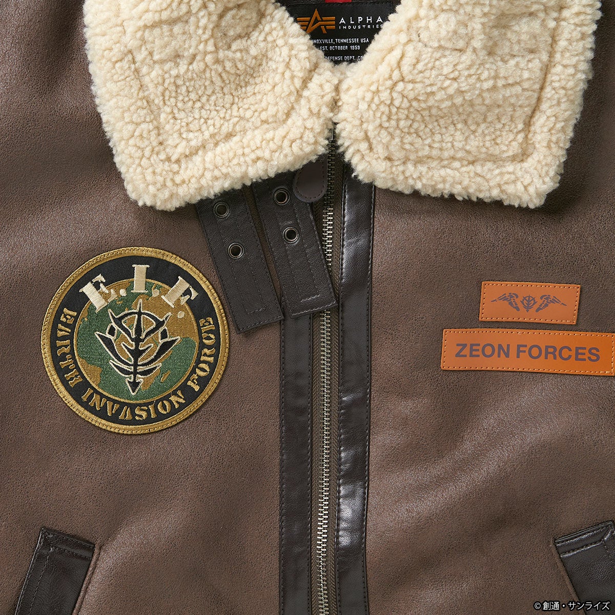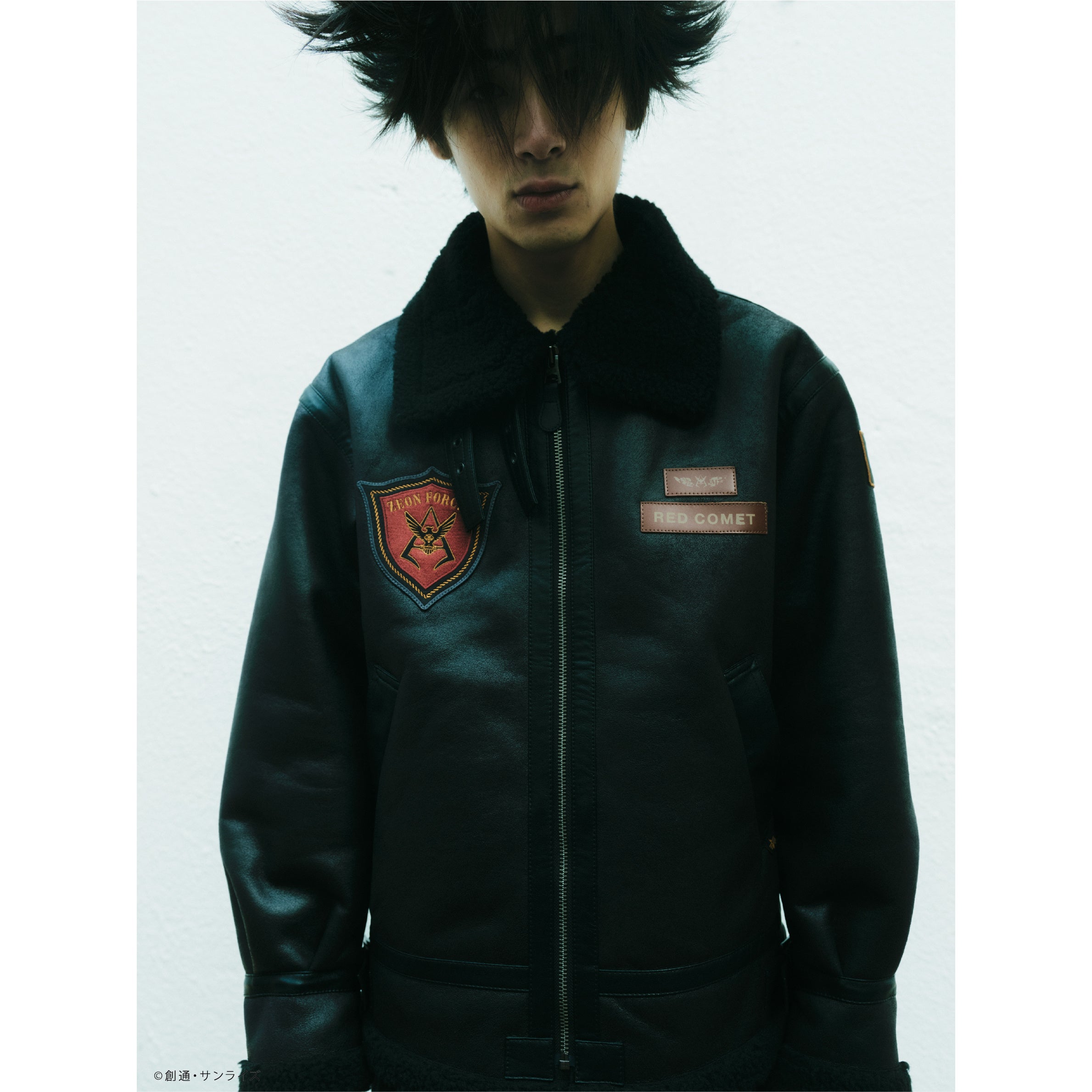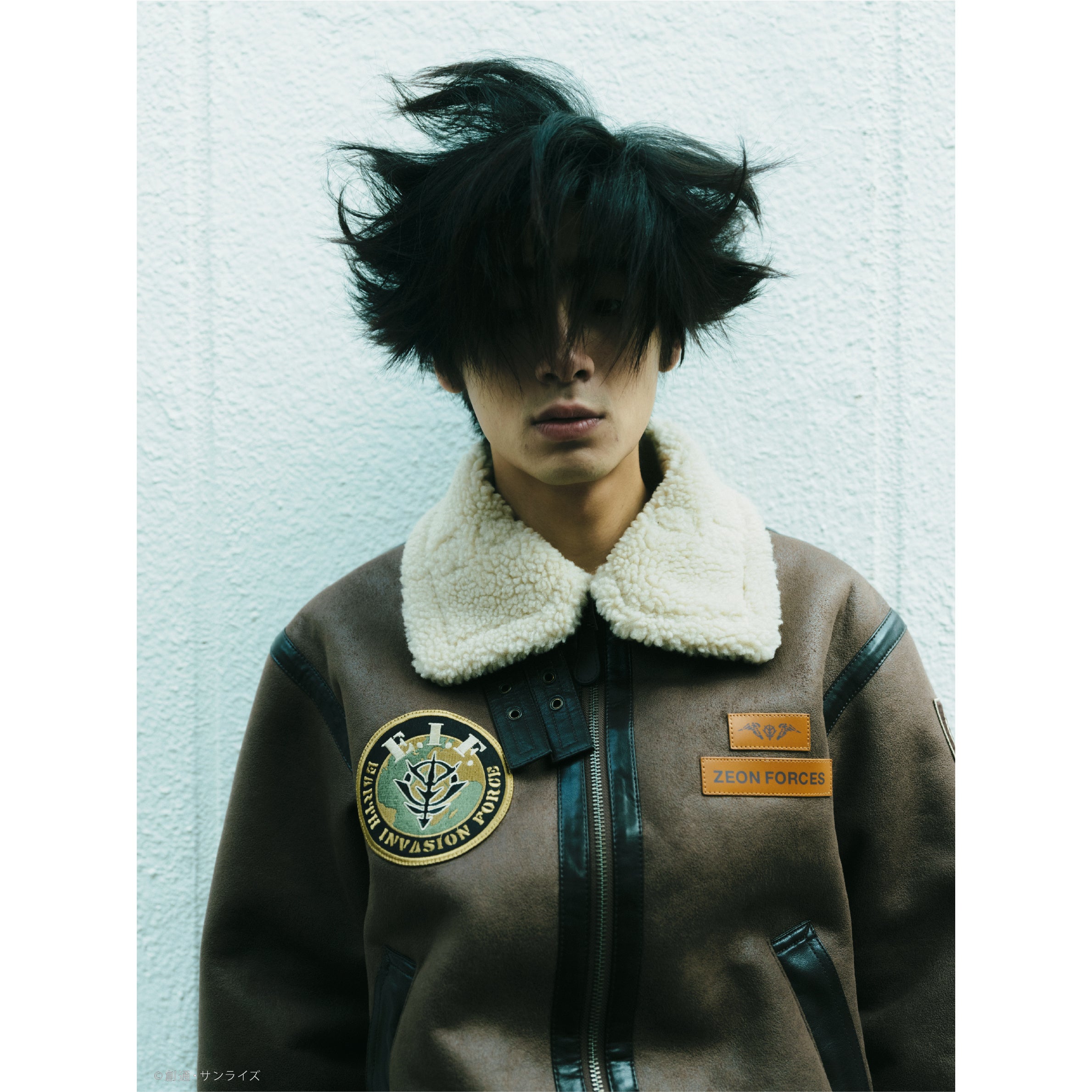 STRICT-GとALPHA INDUSTRIES(アルファ インダストリーズ)のコラボによるフェイクムートン仕様の『機動戦士ガンダム』B-3ジャケットは、リアルに見える素材感にこだわったアイテム。内側全面がボア仕様となっており、保温性と着心地を両立しています。