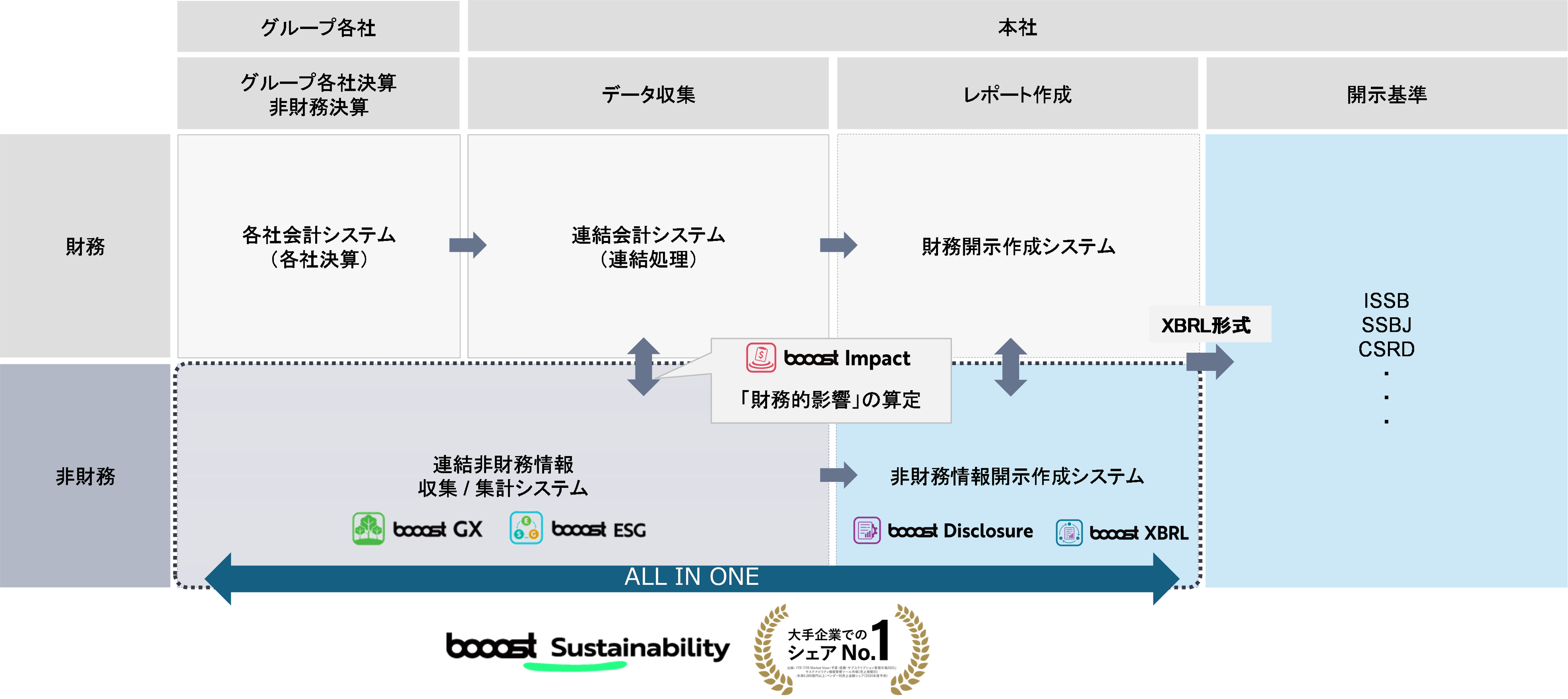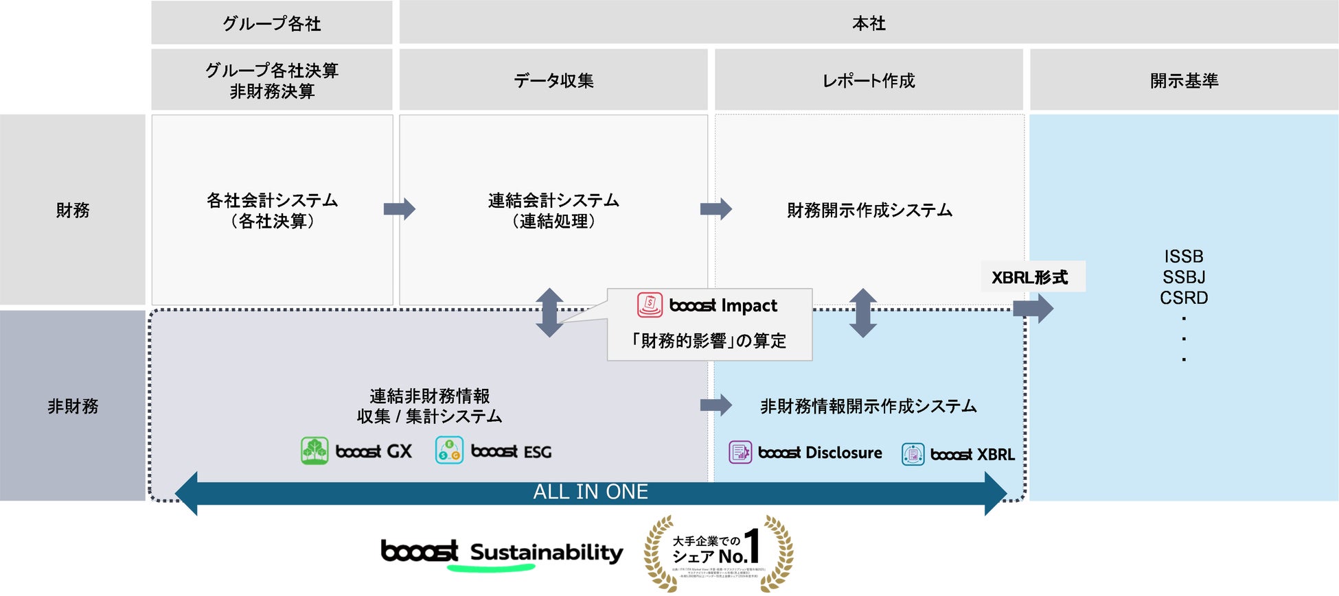当社は、「booost Impact」を通じて非財務的影響を財務諸表に統合し、透明性の高い開示と実効的な経営判断・投資家対話を可能にするとともに、企業のサステナビリティ経営の推進をサポートすべく、「booost Impact」をはじめ、「booost Disclosure」、「booost XBRL」各種機能を拡張することで、サステナビリティERP「booost Sustainability」をさらに進化させ、財務と非財務を統合した“新しい経営OS”の提供と、企業の“攻めのサステナビリティ経営”の実現を推進してまいります。