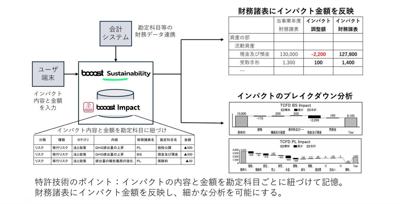 ・ 技術内容: 非財務インパクト(例:気候変動、水使用、人権など)の内容と金額を、勘定科目別に記録し、財務諸表に反映する技術。従来の「集計後に加重」するアプローチではなく、仕訳単位での紐づけにより、粒度の高い定量評価を実現。