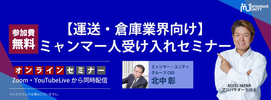 ミャンマー政府認定圧倒的No.1人材送り出し機関「ミャンマー・ユニティ」は、2024年4月17日(水)に「【運送・倉庫業界向け】ミャンマー人受け入れセミナー」を開催いたします。