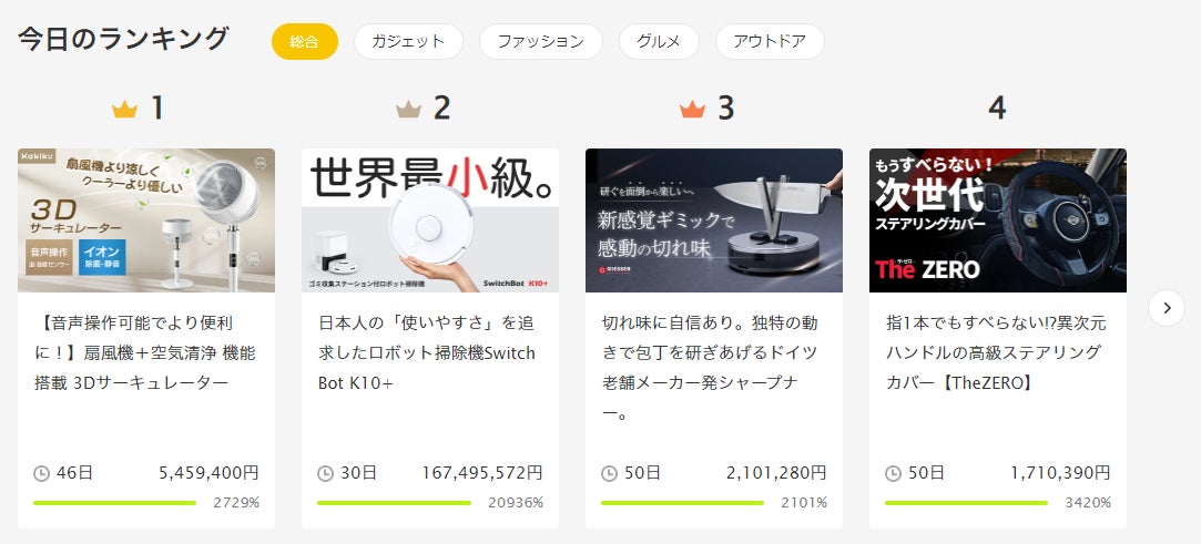 プロジェクト開始から18日で応援総額3000万円を突破、すでに2047名を超える皆様よりご支援いただいております。Makuakeランキング1位を獲得し、注目リターンにも掲載されています。多くの皆さんからのご支援と期待に応え、次世代サーキュレーターが大きな注目を浴びています。