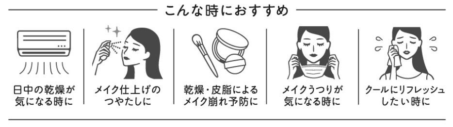 メイクの上からさっぱりと保湿できる超微細なひんやり美容液ミスト。うるおいと自然なつやをあたえ、メイクしたての生つや肌をキープ。長時間メイク崩れも防ぎます。天然香料を使用したみずみずしくフレッシュな白桃の香り。