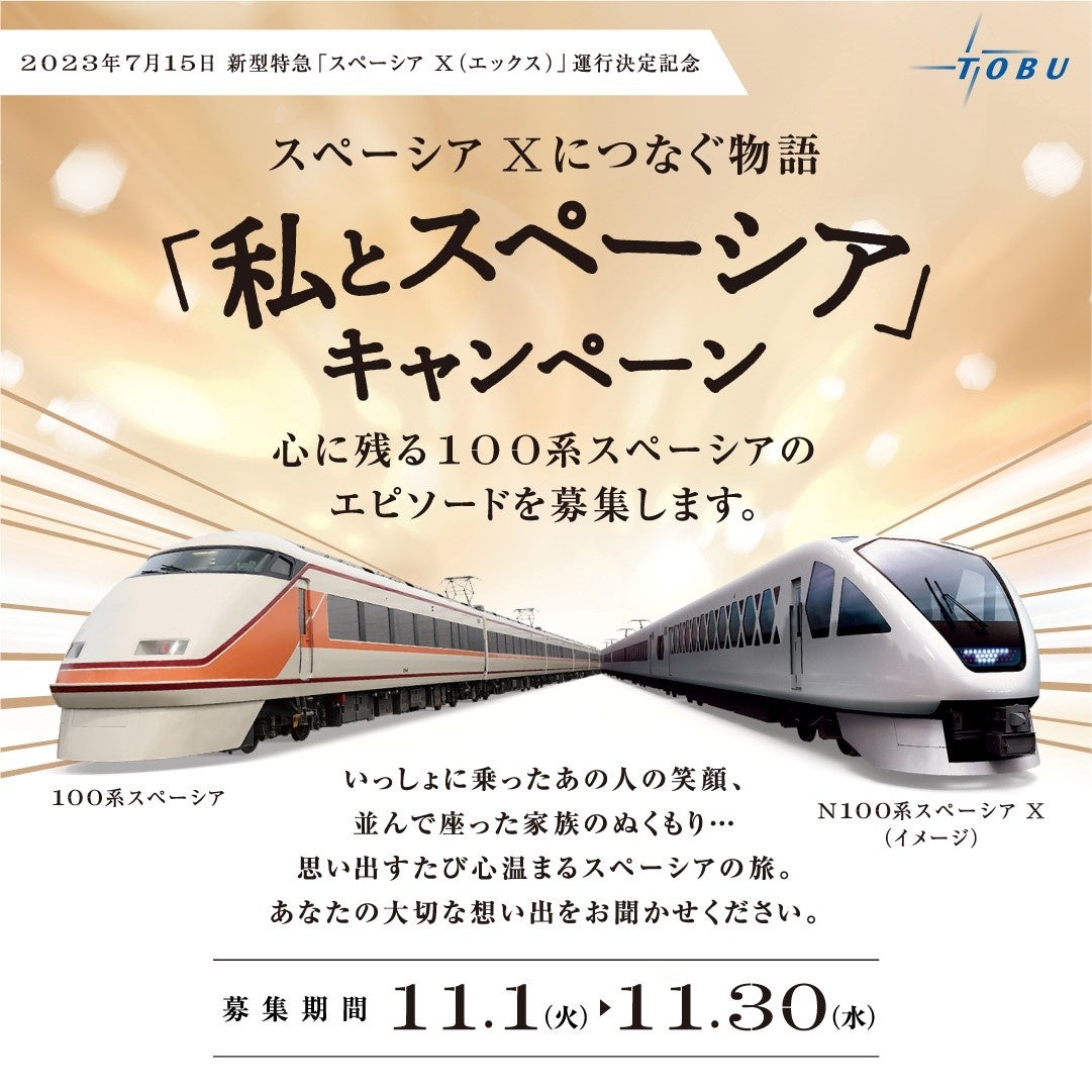 東武鉄道(本社:東京都墨田区)では、2023年7月に導入する新型特急スペーシア Xの運行決定記念として、2022年11月30日(水)まで、「私とスペーシア」キャンペーン~スペーシア Xにつなぐ物語~を実施しています。