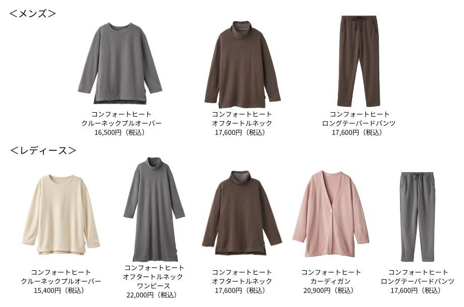 今年は、メンズレディースともに昨年仲間入りしたあたたかみのあるスモーキーグレーに加え、モカの新色が登場。レディースの『クルーネックプルオーバー』、『ロングテーパードパンツ』には、昨年一部店舗限定で展開したアイボリーが好評につき通常ラインナップとして登場し、『オフタートルネック』のアイボリーは今回新色として登場します。冬らしいカラーが加わった『COMFORT HEAT』シリーズとともに、長引く夏の疲れをケアしながら、至福のリラックスタイムをお過ごしください。