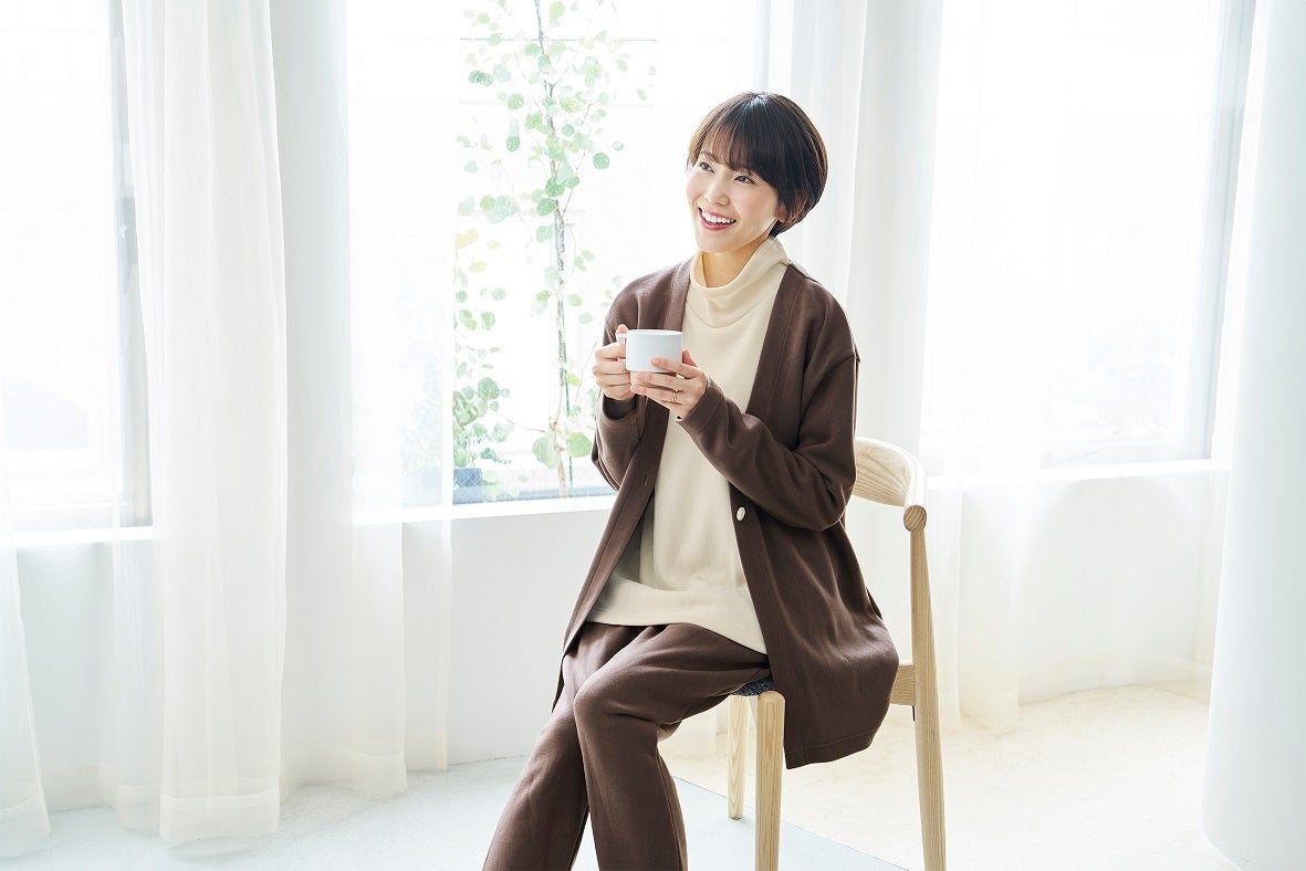 お客様の要望にお応えし、肌寒い時にさっと羽織れるカーディガンが復活登場。長めの丈が、気になるヒップ周りもカバーしてくれて、自宅で過ごすリラックスタイムに大活躍。