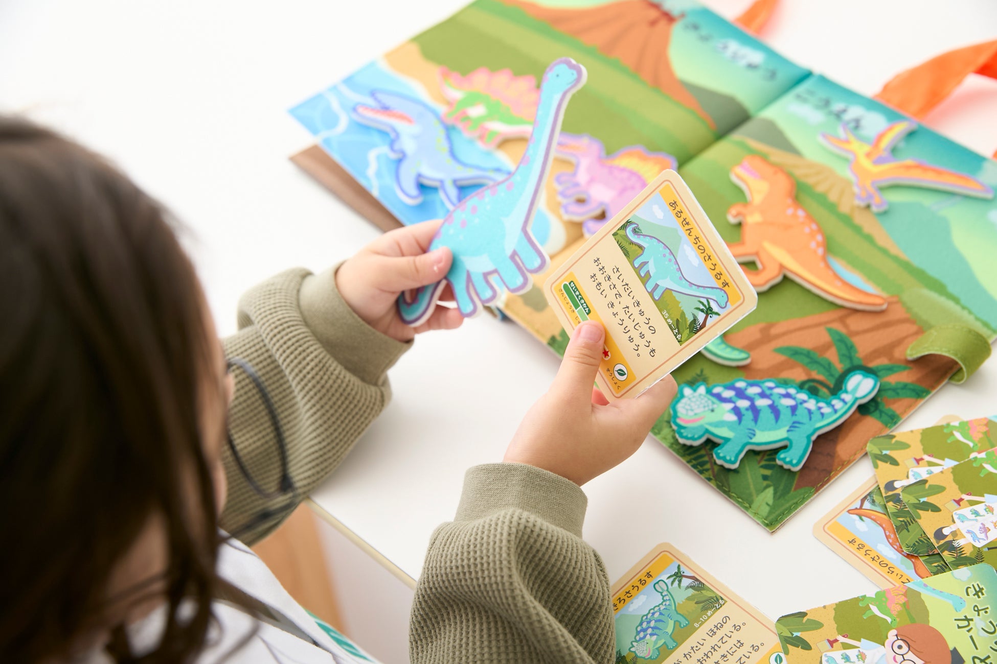 フェルト製のカラフルな恐竜たちや、バラバラになった恐竜の化石、発掘道具、恐竜のスペックカードやクイズカードを使って、恐竜について遊びながら学べます。白衣風エプロンを着て博士になりきって遊んだり、エプロンに恐竜を貼ってデコったり、恐竜を知らないお子様にも詳しいお子様にも幅広く楽しめる内容となっております。