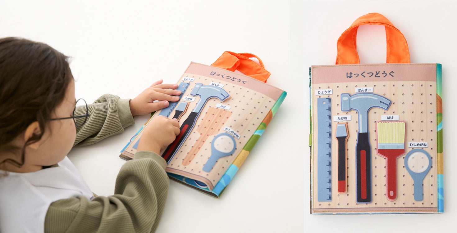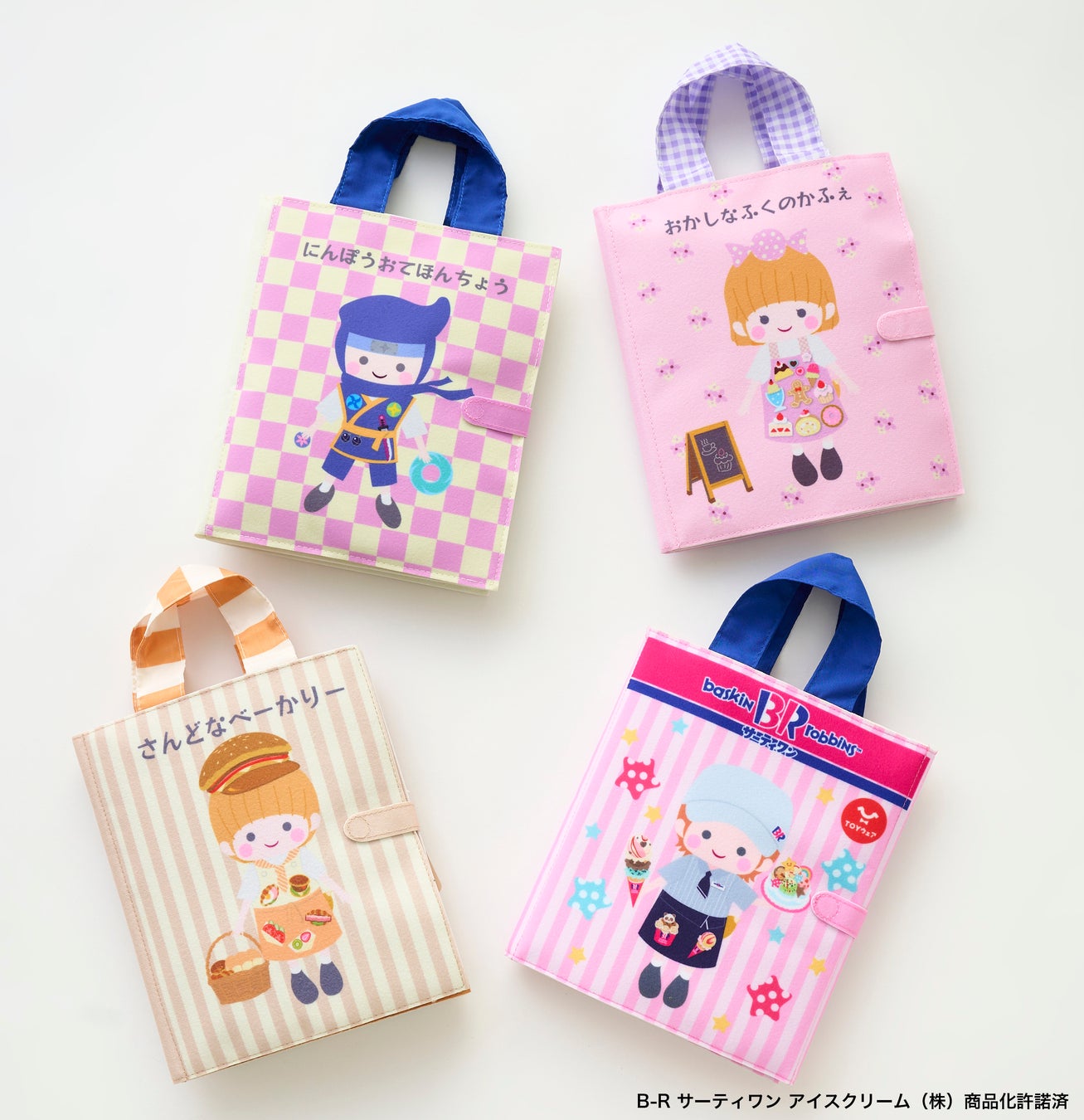 子どもが楽しめる服を作りたい!という思いをもとに、 “知育要素や手軽さ”も取り入れた、新しい形のおもちゃです。「なりきりエプロン」と「フェルト小物」が絵本に集約され、バッグのように持ち運びが可能で、いつでもどこでも子どもが楽しめる「なりきりごっこ遊び」ができるのが特徴です。