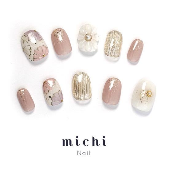 くすみカラーのホワイトとピンクをベースにした和柄フラワーのネイル。ぷっくりとしたお花とゴールドのラインアートがポイントです。レトロと今っぽさが融合したデザインで、洋服にも着物にも合うネイルです。