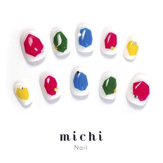 白をベースにカラフルなアートが目を惹くこちらのネイル。多角形のカラフルなフィルムが埋め込まれています。個性的でレトロな雰囲気がかわいいデザインなので、だれともかぶらないおしゃれなネイルをお探しの方にお勧めです!!