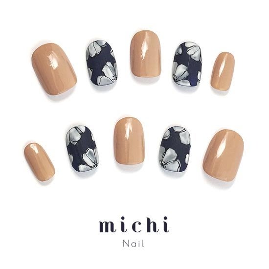 ネイビーとベージュの組み合わせがおしゃれなネイル。花柄アートはマットに仕上がっています。艶とマットの両方が楽しめるデザインで、ファッションに合わせやすいカラーなのも魅力的です。
