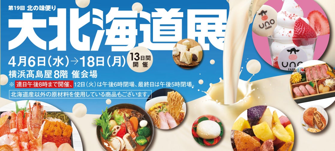 横浜高島屋では、4月6日(水)~4月18日(月)の期間、「第19回 北の味便り 大北海道展」を開催いたします。今回は、“牛乳“を使ったミルクグルメを特集、定番のソフトクリームやパフェのほか、”牛乳“の飲み比べセットや、”牛乳“を使ったラーメンなど、総勢18ブランドのミルクグルメをご用意いたします。北海道の魅力のひとつでもある”牛乳“にスポットを当て、子どもから大人まで楽しめるミルグルメを多数ご用意することで、再び供給過剰が懸念されている牛乳の消費にもつなげます。