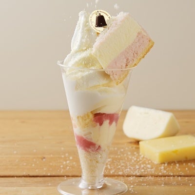 5種類のチーズを使用したフロマージュソフトとジャージーミルクソフトのミックスの間に、北海道産の苺ソースとベイクドチーズをしのばせました。ドゥーブルフロマージュをイメージし、ゴーダチーズパウダーで仕立て、春の期間限定、北海道苺のドゥーブルフロマージュをトッピング。6種のチーズや練乳など計12種類もの乳製品を使用し、濃厚・ミルキーな味わいをお楽しみいただけます。