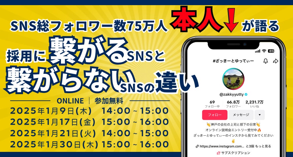 <総フォロワー数75万人超え>SNS採用のパイオニアが語る採用に繋がるSNSと繋がらないSNSの違い|無料セミナー開催