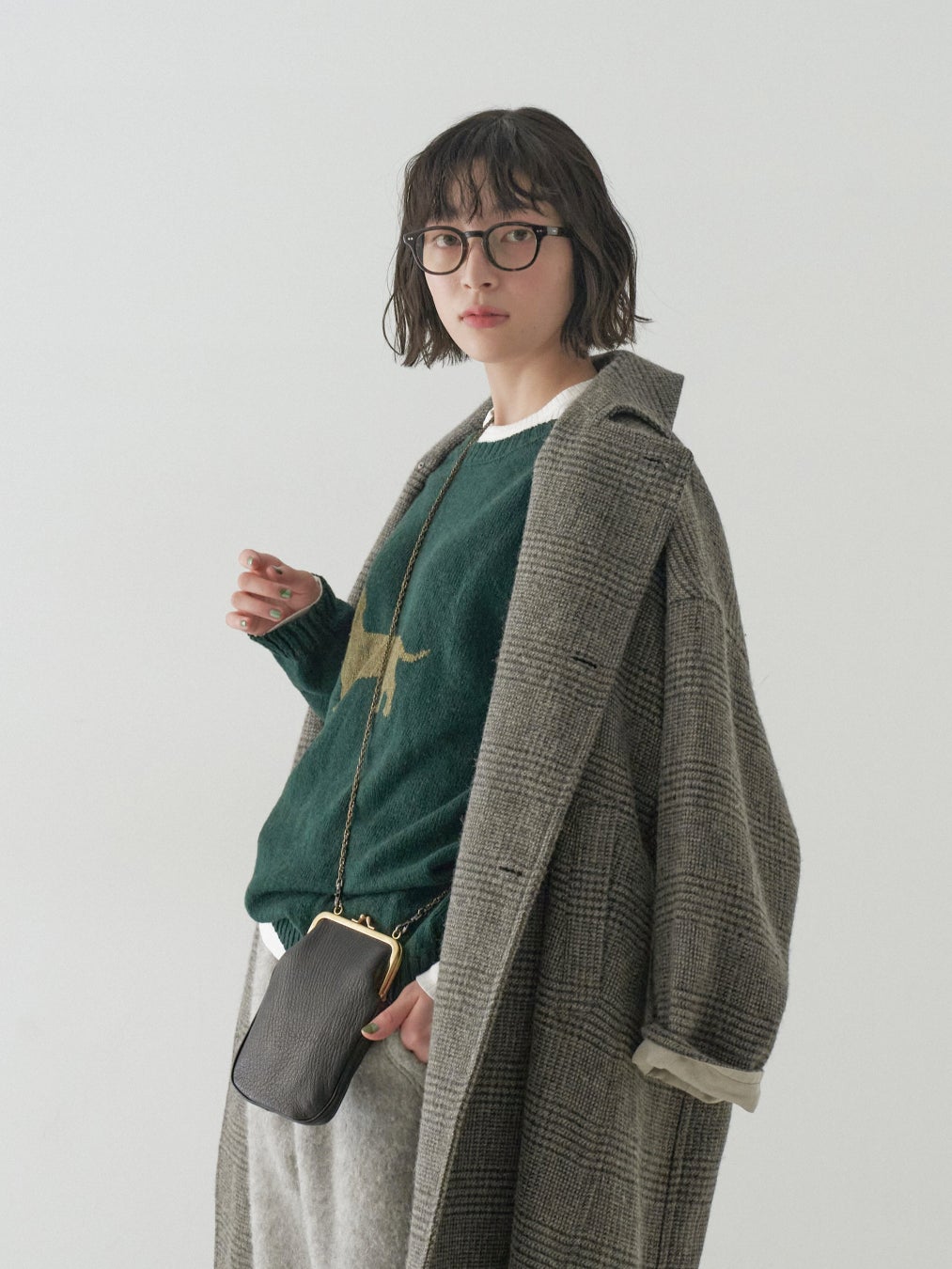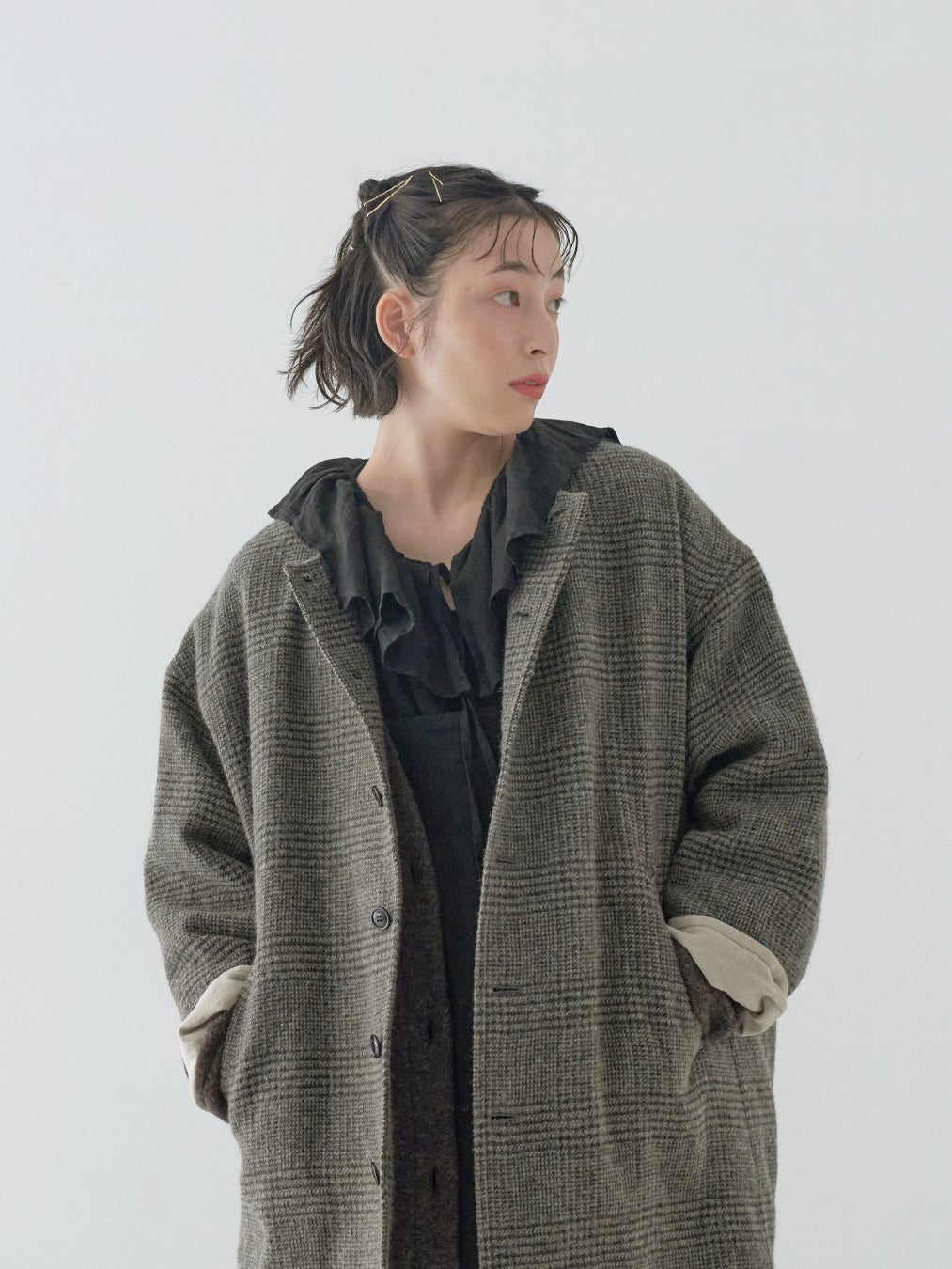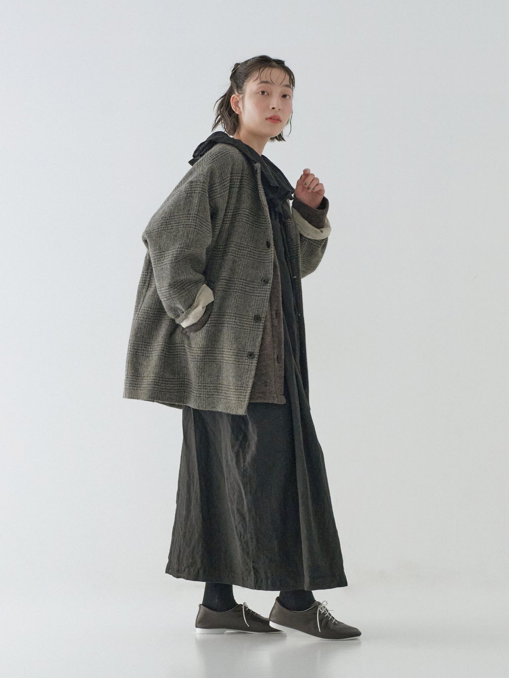 シェットランドウール(淡色)とリネン(濃色)を使用した交織グレンチェックのリネンウール素材を使用。交織し、さらに洗い加工を施すことで、生地に凹凸感が生まれ、味わい深い風合いに仕上がります。裏地には、リネンを使用。秋冬に悩まされる静電気も起こりにくく、天然素材ならではの、優しい肌触りが心地良い仕上がりとなっております。