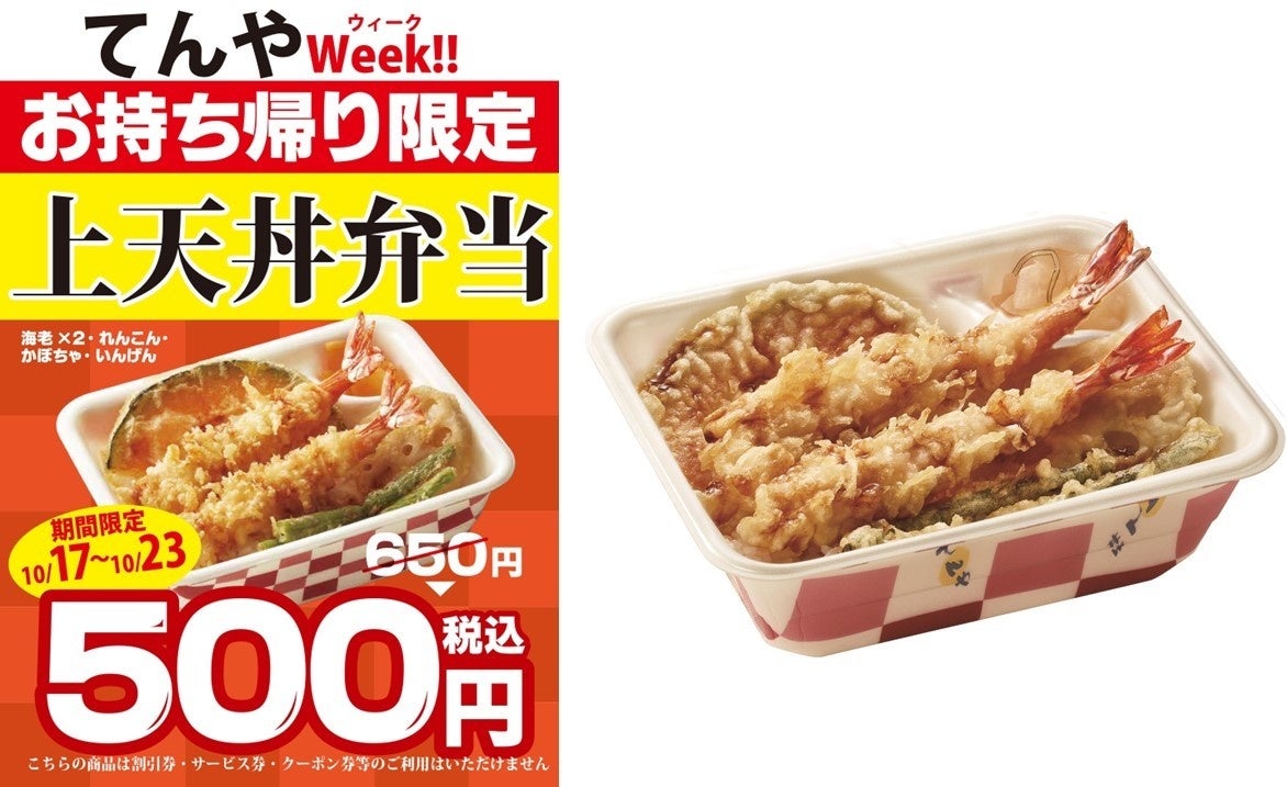 日頃のご愛顧に感謝を込めて“てんやWeek”10月も開催!10月17日(月)~10月23日(日)の1週間限定 テイクアウト「上天丼弁当」を特別価格でご提供