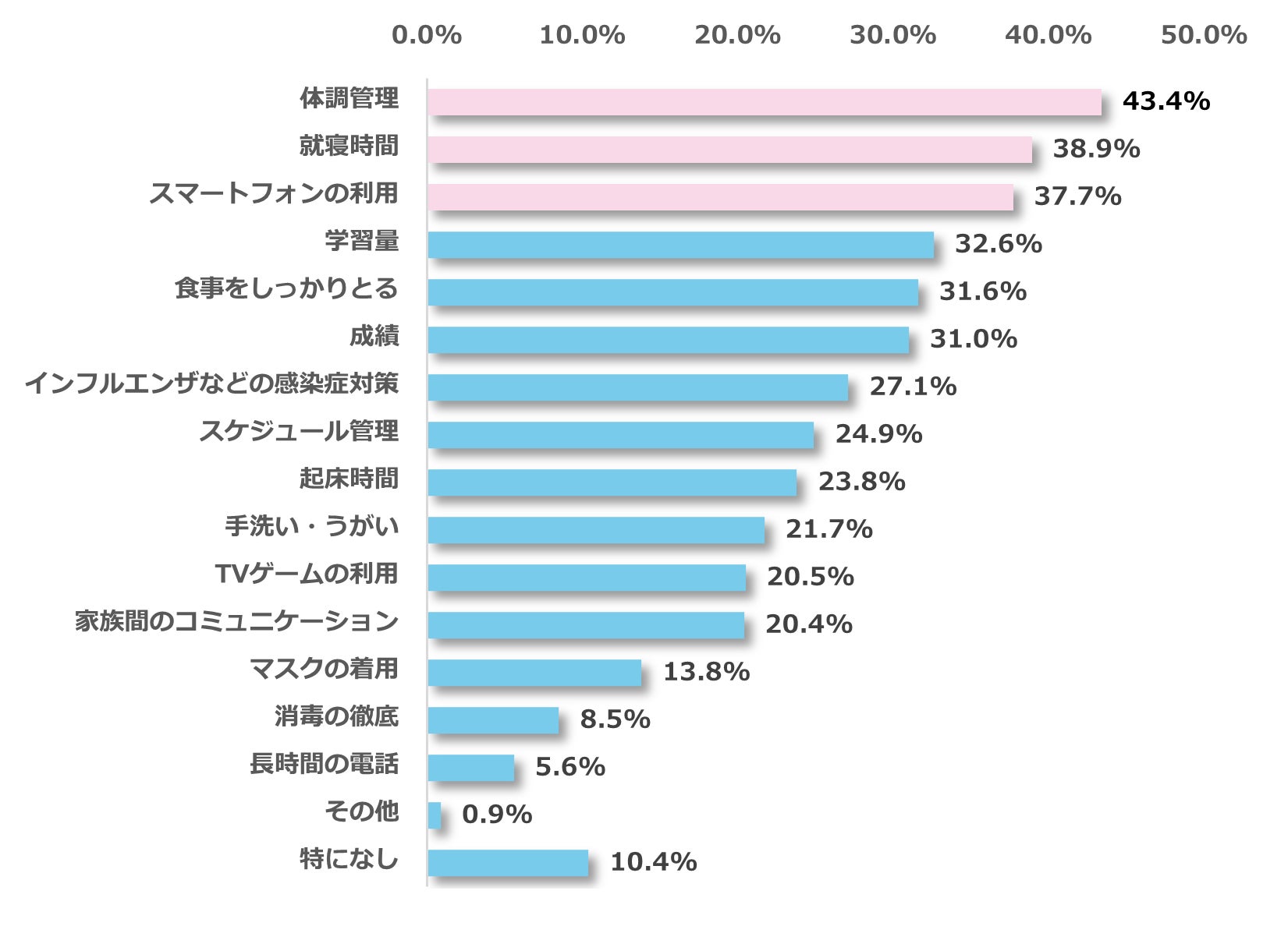 ・保護者の注意TOP3は「体調管理」「就寝時間」「スマートフォンの利用」