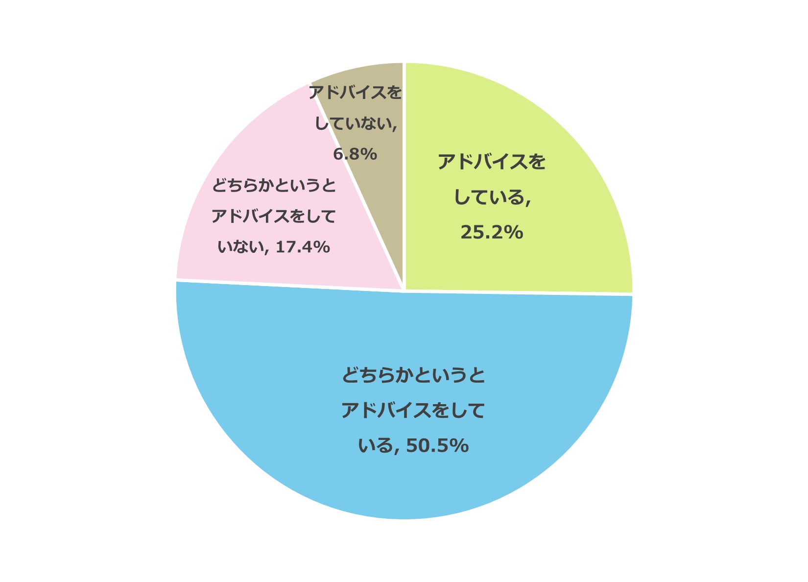 子どもにアドバイスをすることがあるか質問しました。その結果、 75.7%が「アドバイスをしている」(アドバイスをしている:25.2%、どちらかというとアドバイスをしている:50.5%)と回答しました。