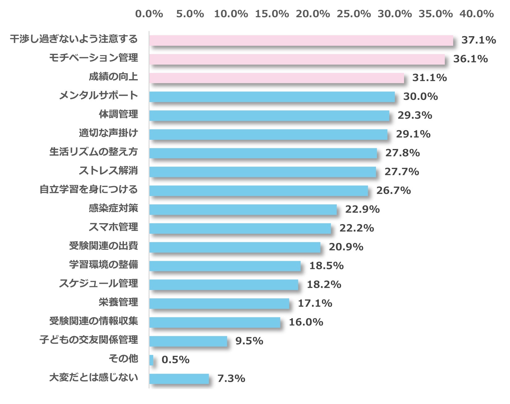 受験生の保護者がもっとも大変だと感じること、最多回答は「干渉し過ぎないよう注意する(37.1%)」