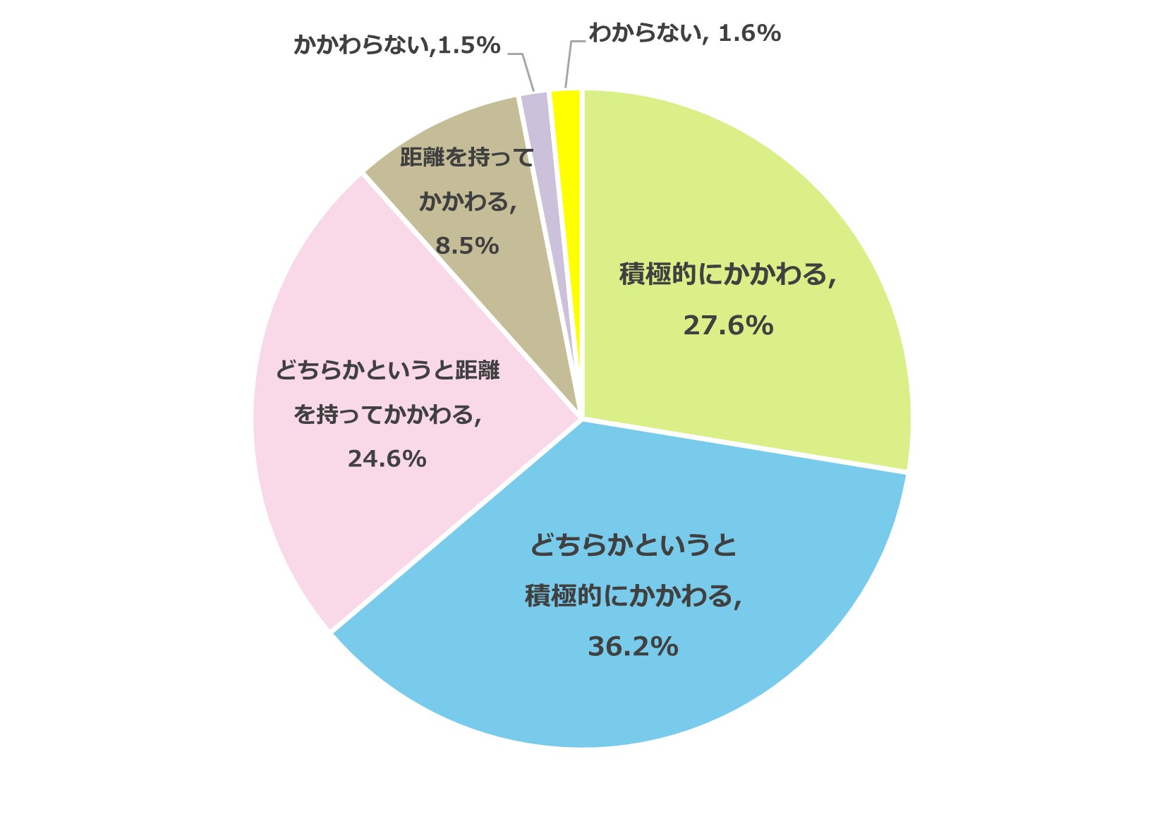 子どもの受験に対して、保護者としてどのようなかかわり方が適切だと思うかを質問しました。その結果、 63.8%が「積極的にかかわる」(積極的にかかわる:27.6%、どちらかというと積極的にかかわる:36.2%)と回答しました。一方で、33.1%が「距離を持ってかかわる」(距離を持ってかかわる:8.5%、どちらかというと距離を持ってかかわる:24.6%)と回答しました。