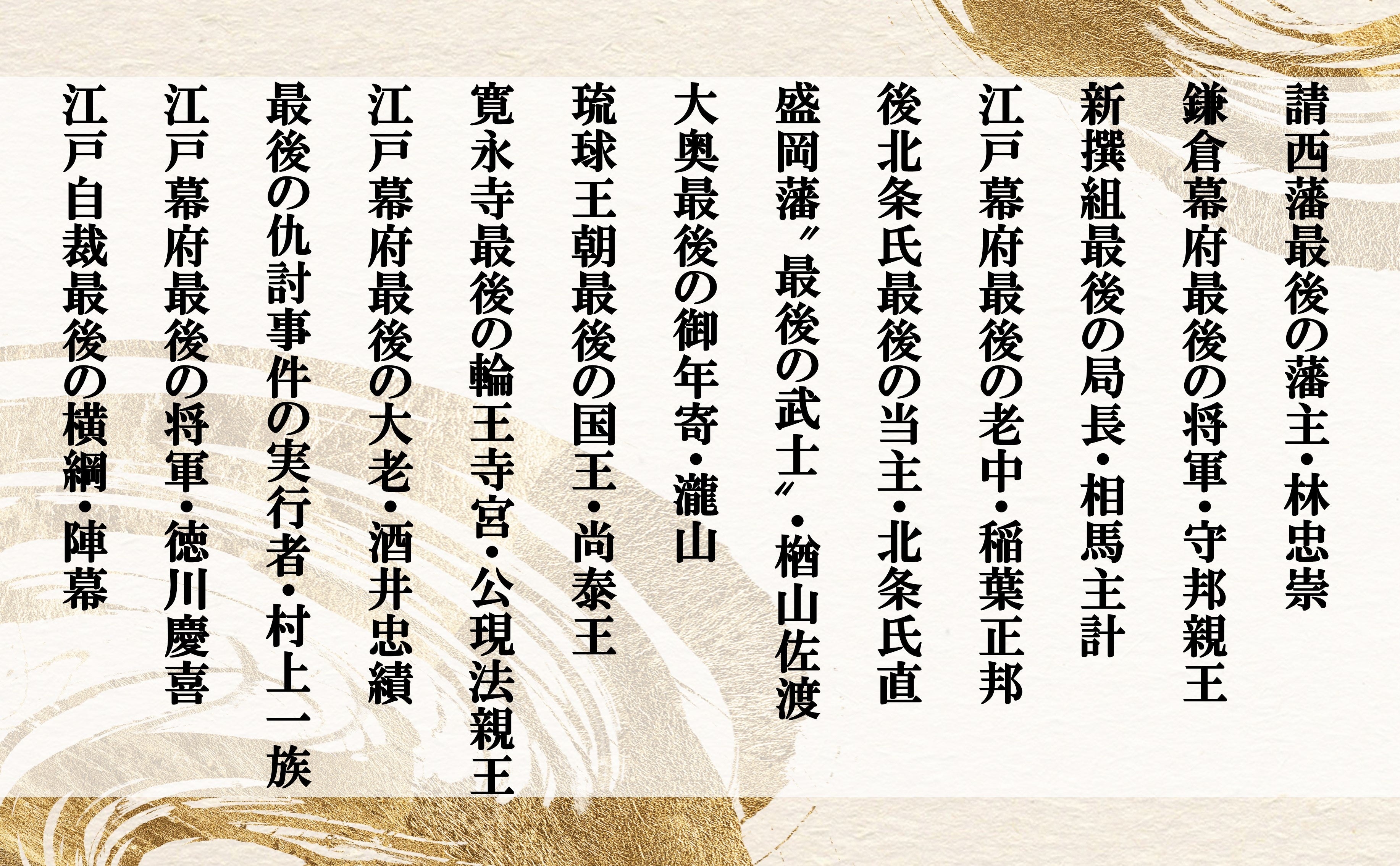 日本の歴史を見渡してみれば、「最後の〇〇」が様々あり、そこには、教科書には出てこないドラマ、意外すぎるラストが遺されていました。