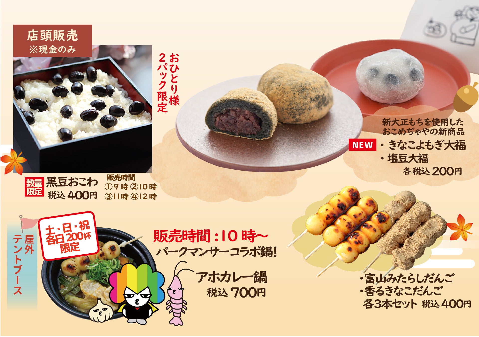 毎回大好評!行列のできる黒豆おこわ・特別価格のだんご・お得なお楽しみ袋・季節商品も販売
