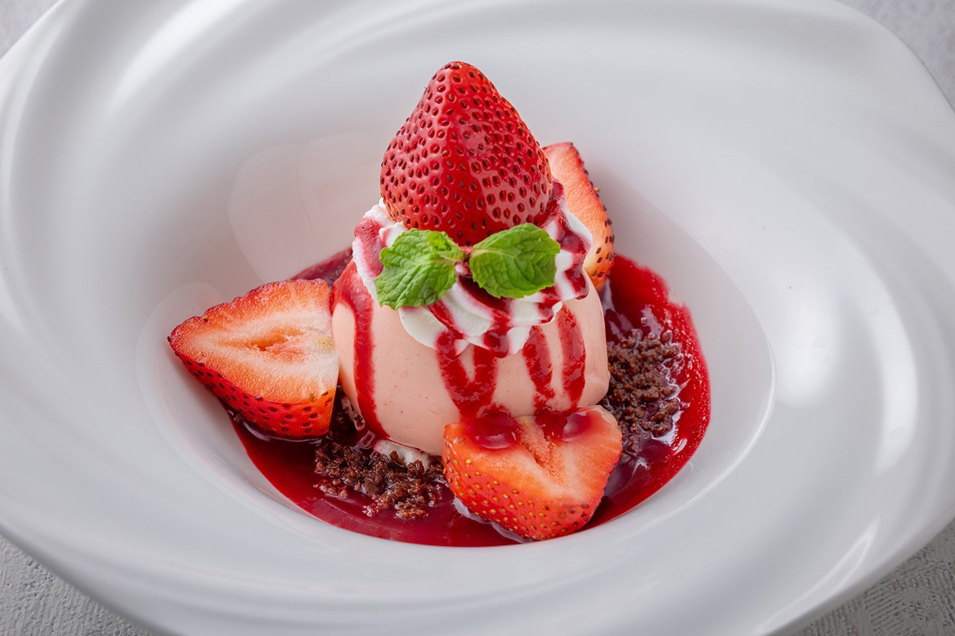 苺のアイスクリームに、木苺のソースをたっぷりかけた贅沢な一皿。ソースには香ばしいクランチを合わせ、食感のコントラストもお楽しみいただけます。