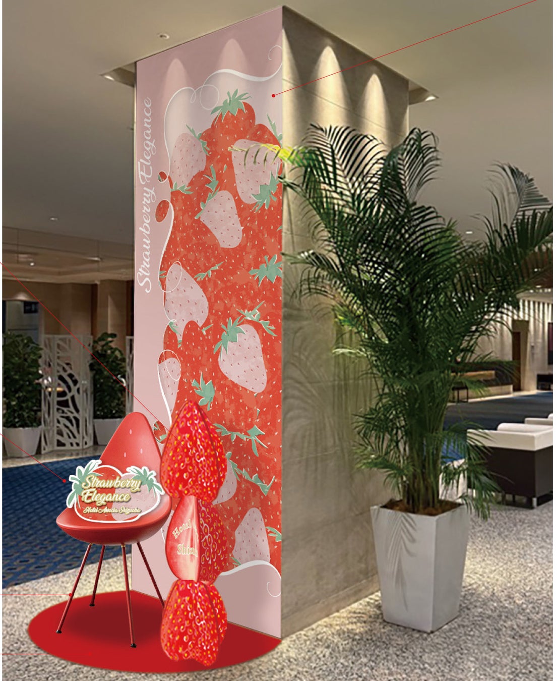 期間中は、ロビーの柱に「Strawberry Elegance」をテーマにしたデザイン装飾を施します。苺をモチーフにしたグラフィックシートをあしらった柱の前には、苺のオブジェと椅子を設置。レストランでのひとときに加え、ご来館の記念として写真撮影もお楽しみいただけます。