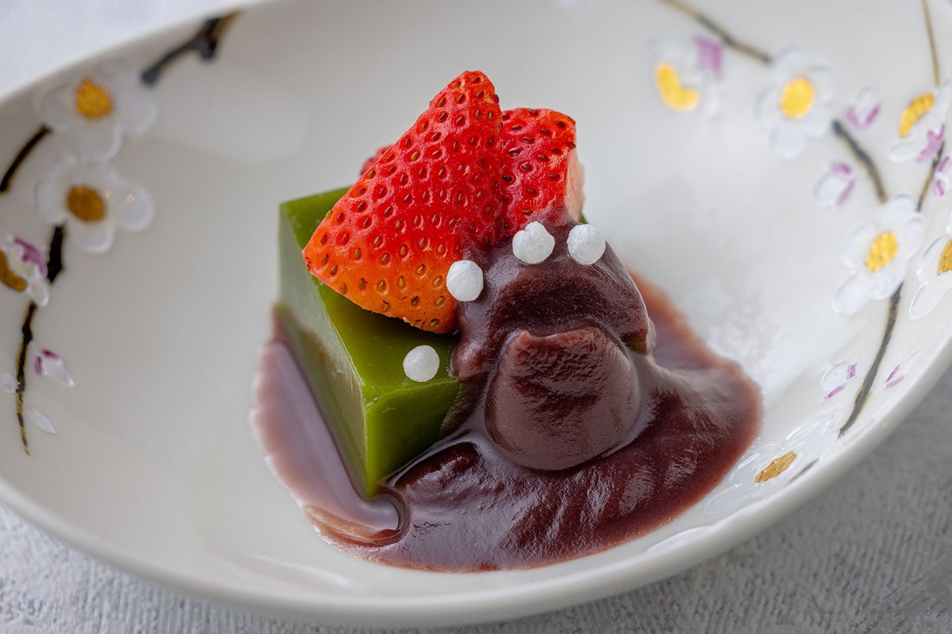 宇治抹茶を使った濃厚な抹茶ゼリーに、香り豊かな小豆ソースと苺を添えたスイーツ。抹茶のほろ苦さと小豆の甘味、苺の爽やかさが絶妙に調和します。