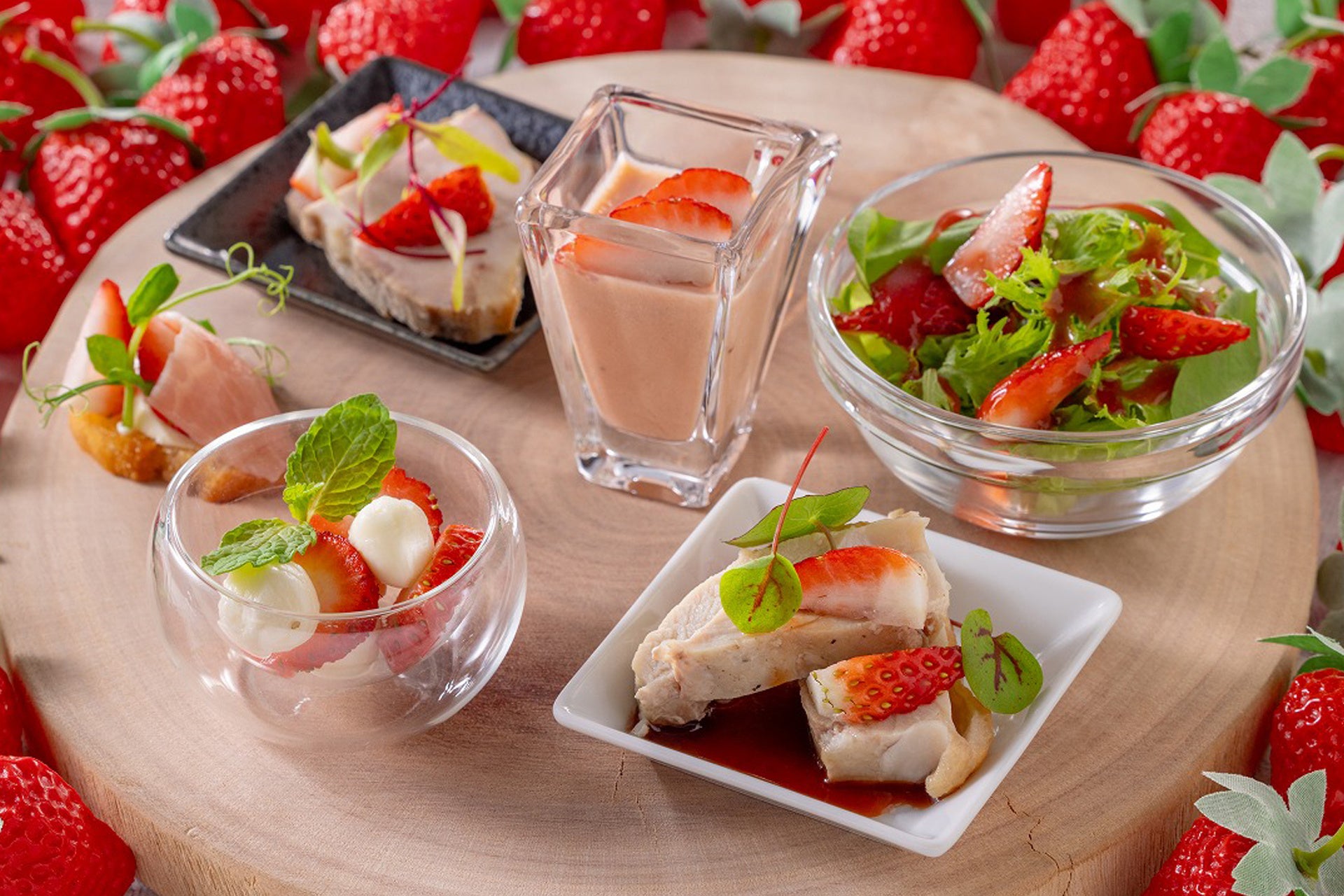 苺と生ハムを合わせたクロスティーニなど、苺をアクセントにした料理が並びます。苺のビネグレットで味わうサラダもおすすめ。