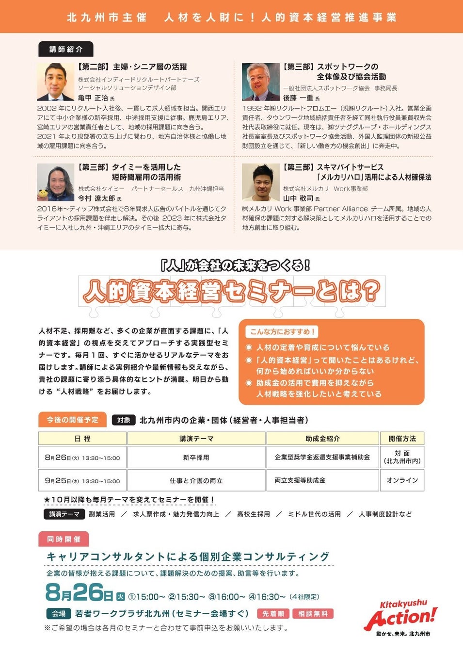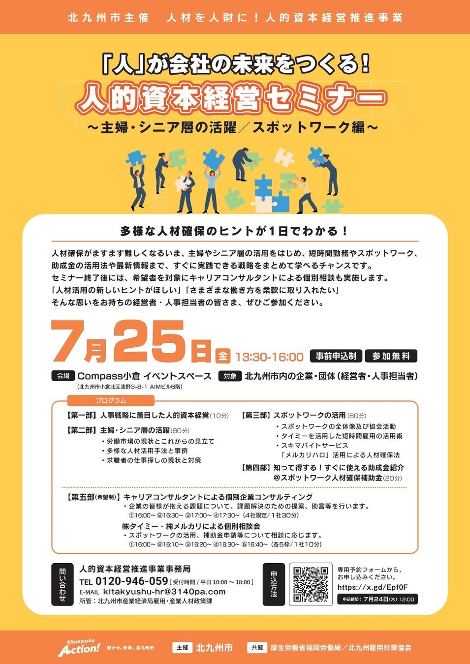 北九州市【7月25日開催】人材確保のカギは“主婦・シニア層”“スポットワーク”「人的資本経営セミナー」参加企業・団体募集中!