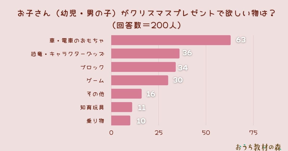 ARINA株式会社が運営する幼児、小学生の親御さん向けの教育メディア「おうち教材の森」(https://naki-blog.com/study/)は、日本全国の幼児のお子さんをお持ちの親御さんを対象に「お子さん(幼児・男の子)がクリスマスプレゼントで欲しい物は?」とアンケート調査を実施しました。その結果を公表します。