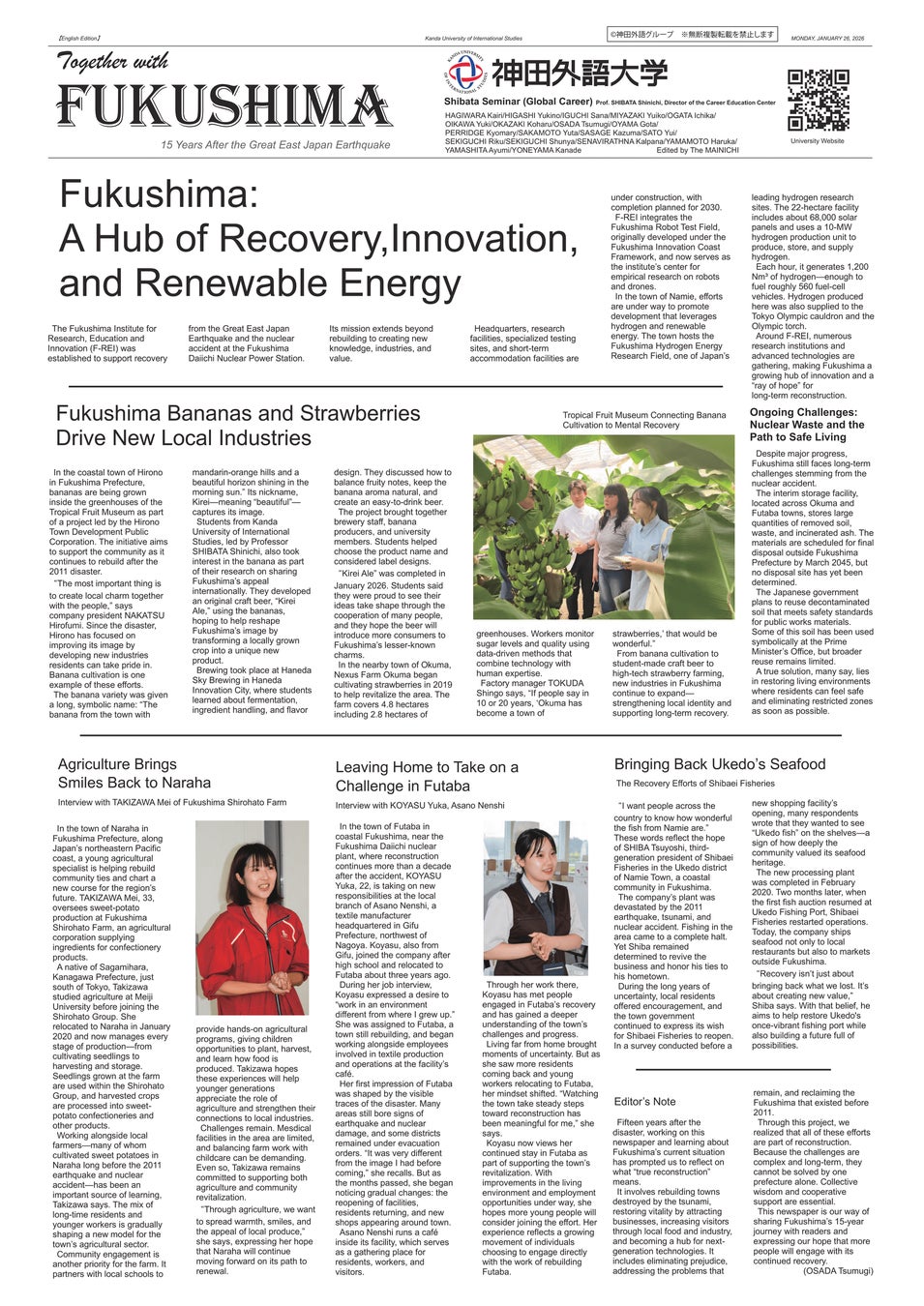 その一環として実施しているのが、学生主体による「震災復興発信プロジェクト」です。中心を担うのは、グローバル人材の育成を目指す神田外語大学・柴田真一ゼミの学生19名で、2025年8月には福島県浜通り地域を訪問。震災復興や新産業、特産品、地域振興など、「福島の過去・現在・未来」を自らの目で取材し、その経験と学びをもとに日英版の震災復興新聞『福島とともに(英題”Together with Fukushima”)』を完成させました。