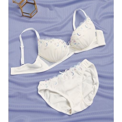 夜空をモチーフにした刺繍を、繊細なグラデーションカラーで仕上げたブラジャー&ショーツのセットです。肌に触れるカップ裏は綿100%でやさしくバストを包みます。上下セットブラへのデビューにピッタリの一着! サイズもA65~E80と豊富に揃えています。