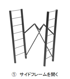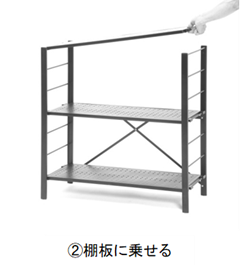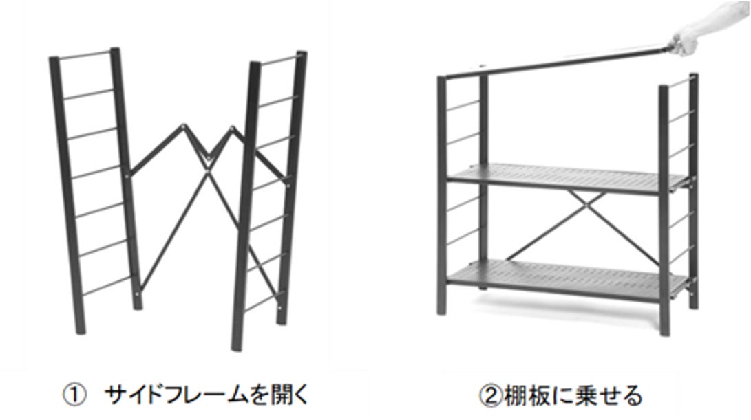 本製品の特徴の一つが組み立てやすさ。折り畳み式になっているサイドフレームを左右に広げ、棚板を好きな高さに乗せるだけ。約5分(3段タイプの場合)で簡単に組み立てることができます。