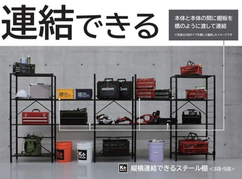 フレームを開いて、棚を乗せるだけ。簡単に組み立てができる連結することでレイアウトが自由自在の収納棚 コメリオリジナルブランド「K+BUILD」より「縦横連結できるスチール棚」が発売