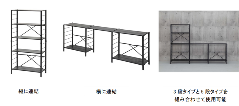 5段タイプは縦に連結して高い棚として、分割して低い棚として、用途に合わせて使用することができます。また、3段タイプと5段タイプを連結することもできるので、自分好みにレイアウトが可能です。