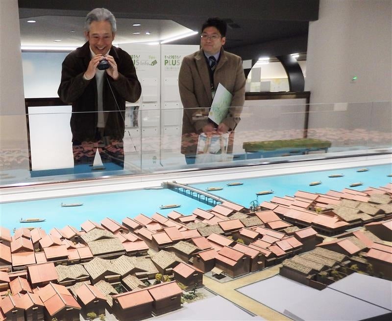 東尋坊は生憎、風も強く肌寒かったが、鶴見さん自身が「旅行で来た中学生2年以来」という絶壁の岩場とも“対面”。さらに龍翔博物館では4階の展望テラスから、九頭竜川河口や川沿いに広がる三国湊の街の風景を眺めたほか、展示コーナーで江戸時代の三国湊の蔵並みジオラマや三国の工芸品類、三国祭の巨大な山車(やま)などを見学。角学芸員が三国湊の街中を見下ろしながら、「三国湊はこの九頭竜川河口に古くから水運・海運の拠点として発達し、朝倉氏にも富をもたらした。義景は東北の大名に通好を求めたり、九州の島津氏を通じ琉球との交易にも興味を示していた。この三国湊から越前の外を見据えていた」と解説すると、鶴見さんは「なるほど、朝倉氏の財力の源がこの三国湊にあったのですね」と返していた。